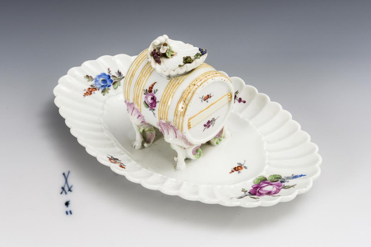 Senfgefäss in Form eines Fasses mit vier Bocksfüßen und Muscheldeckel, auf ovaler, fester Unterschale mit Blumenmalerei. Muscheldeckel bestoßen, kleiner Chip am Fassrand.
