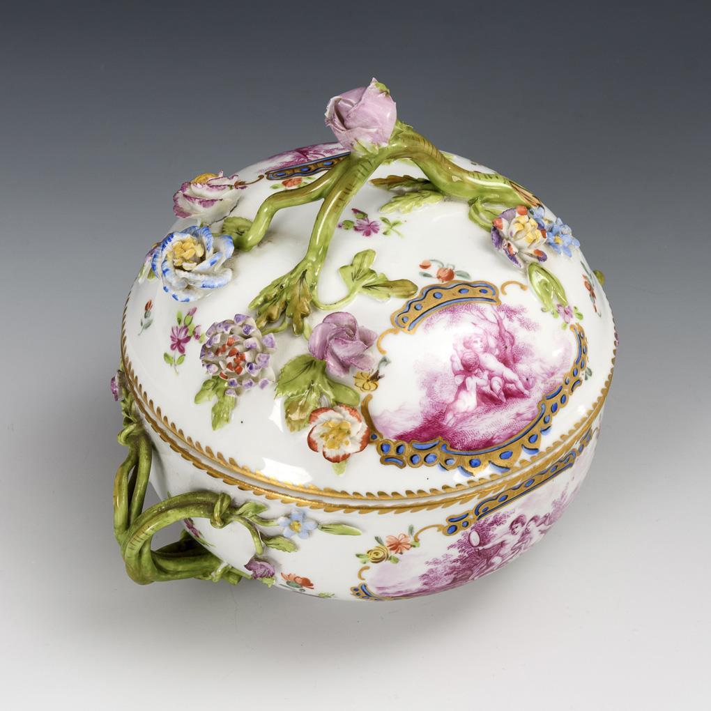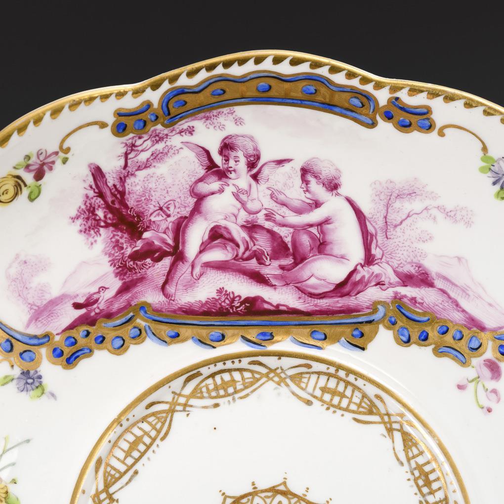 Schale mit zwei Henkeln aus Blütenstängeln, gewölbter Deckel mit Astgriff und Blütenbelag, Presentoir. Mit purpurfarbener Puttenmalerei in Vierpasskartuschen sowie Blumenmalerei. Minimale Bestoßungen am Belag, unterseitig 2 minimale Glasurrestaurierungen.