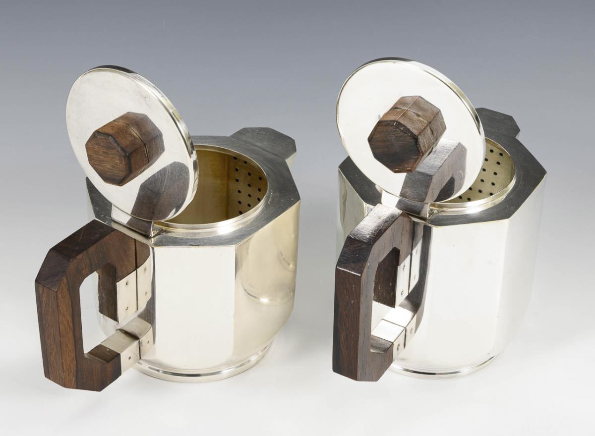 8-eckige Form mit Edelholzgriffen: Kaffeekanne, Teekanne, Zuckerdose und Milchgießer. Gebrauchsspuren, kleine Dellen.