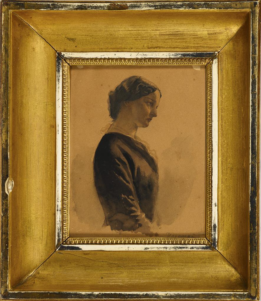 Studie einer jungen Frau im Profil. Leichte Altersspuren.