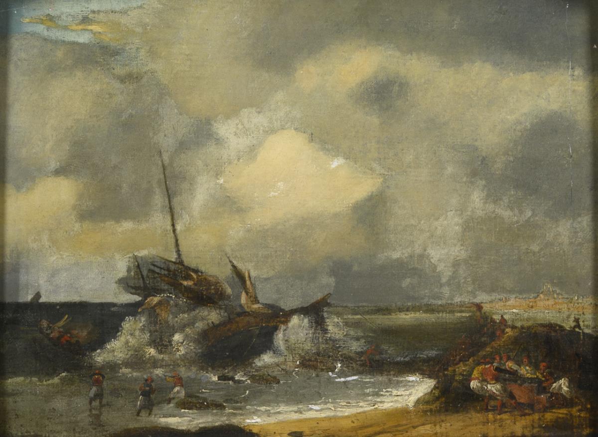 Viele Personen am Strand nahe dem Schiffswrack unter wolkigem Himmel. Altersspuren.