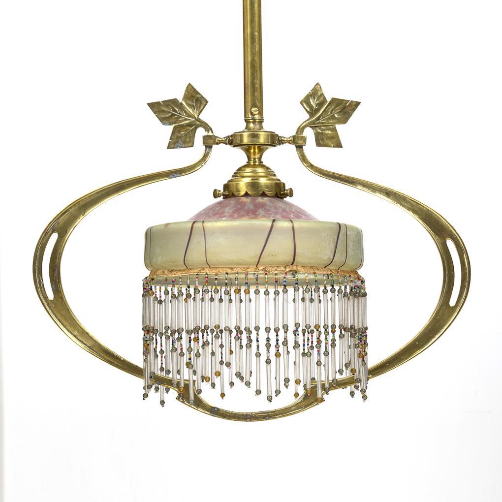 Elegante 1-flammige Hängelampe an Mittelstrebe mit Tellerbaldachin und blattverziertem Messingkranz um Schalenglasschirm mit polychromem Perlbehang; Glasschirm mit rosafarbenen Pulvereinschmelzungen und Fadendekor. Alters-/Gebrauchsspuren, Perlbehang teils fehlend, Metall mit Korrosionsspuren, Glasrand mit kleinen Chips.