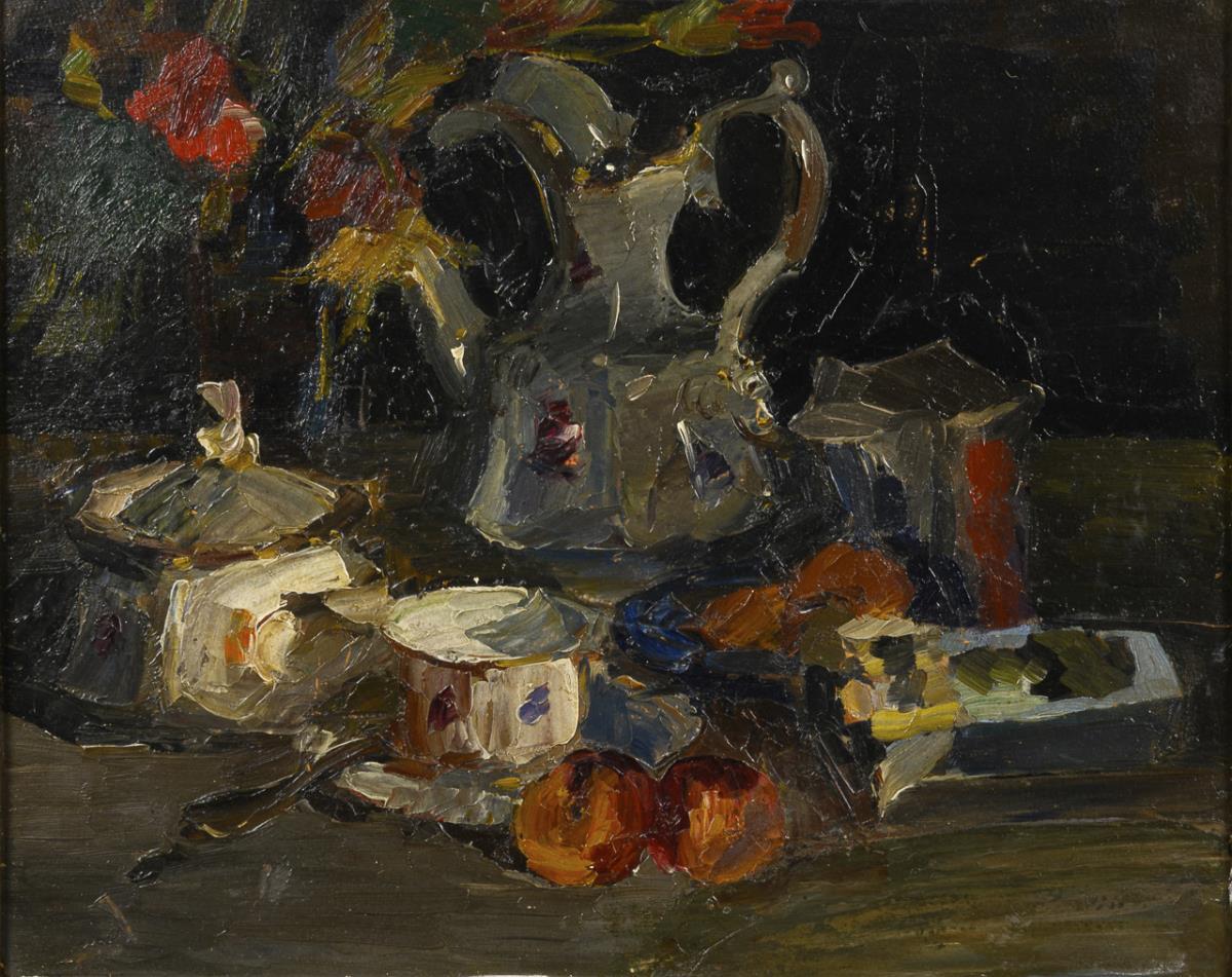 Kaffeetasse und Zuckerdose neben Kanne, Pfirsichen und einem Strauß Blumen.