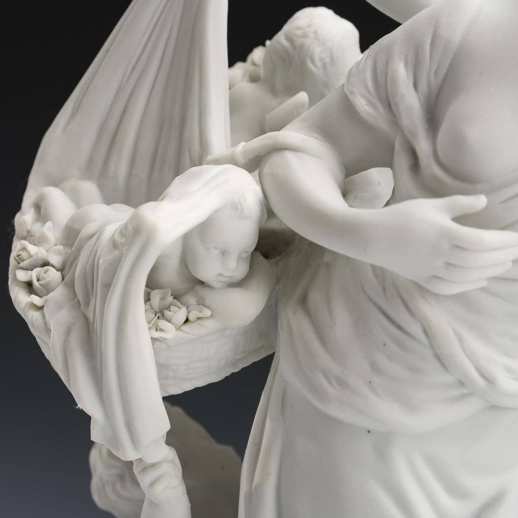 Gruppe dreier antiker Damen mit Rosenkörben und teils in den Körben liegenden Amorknaben. 2 Hände restauriert, minimale Bestoßungen an den Blüten.