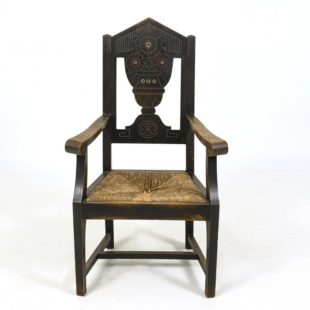 Armlehnstuhl mit trapezförmiger Sitzfläche aus Binsengeflecht und reliefverzierter Rückenlehne mit Blumenbukett. Alters-/Gebrauchsspuren, Binsengeflecht defekt.