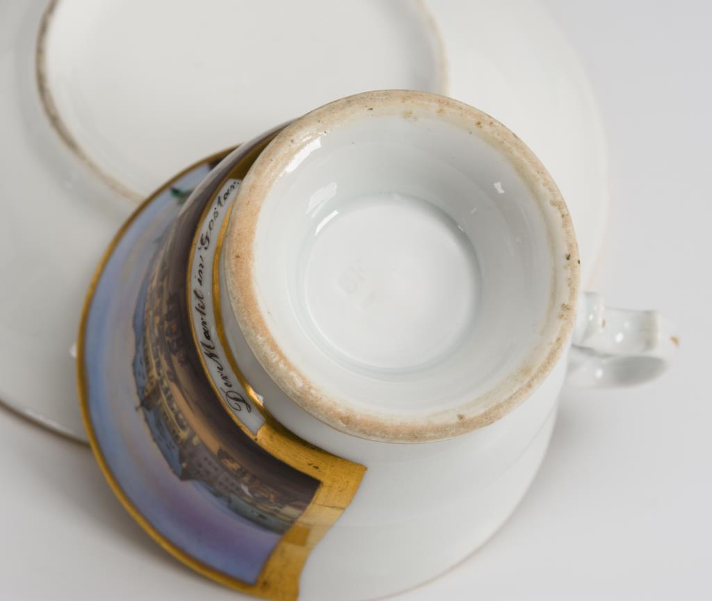 Gefußte Glockentasse mit Rocaillehenkel. Schauseitig eine Rechteckkartusche mit einer bezeichneten Goslar-Ansicht.