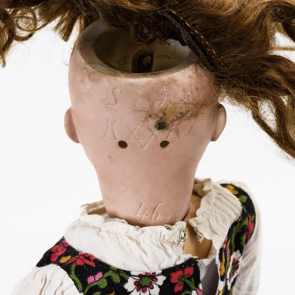 Kurbelkopf, blaue Schlafaugen, Wimpernreste, rotbraune Mohairperücke. 15-teiliger Gliederkörper. Schwarzes Kleidchen mit Blumenmuster, schwarze Lackschuhe. Kopf durchleuchtet: ohne Defekte, lediglich 1 winziger Chip am rechten Ohrläppchen. Körper mit minimalen Übermalungen.