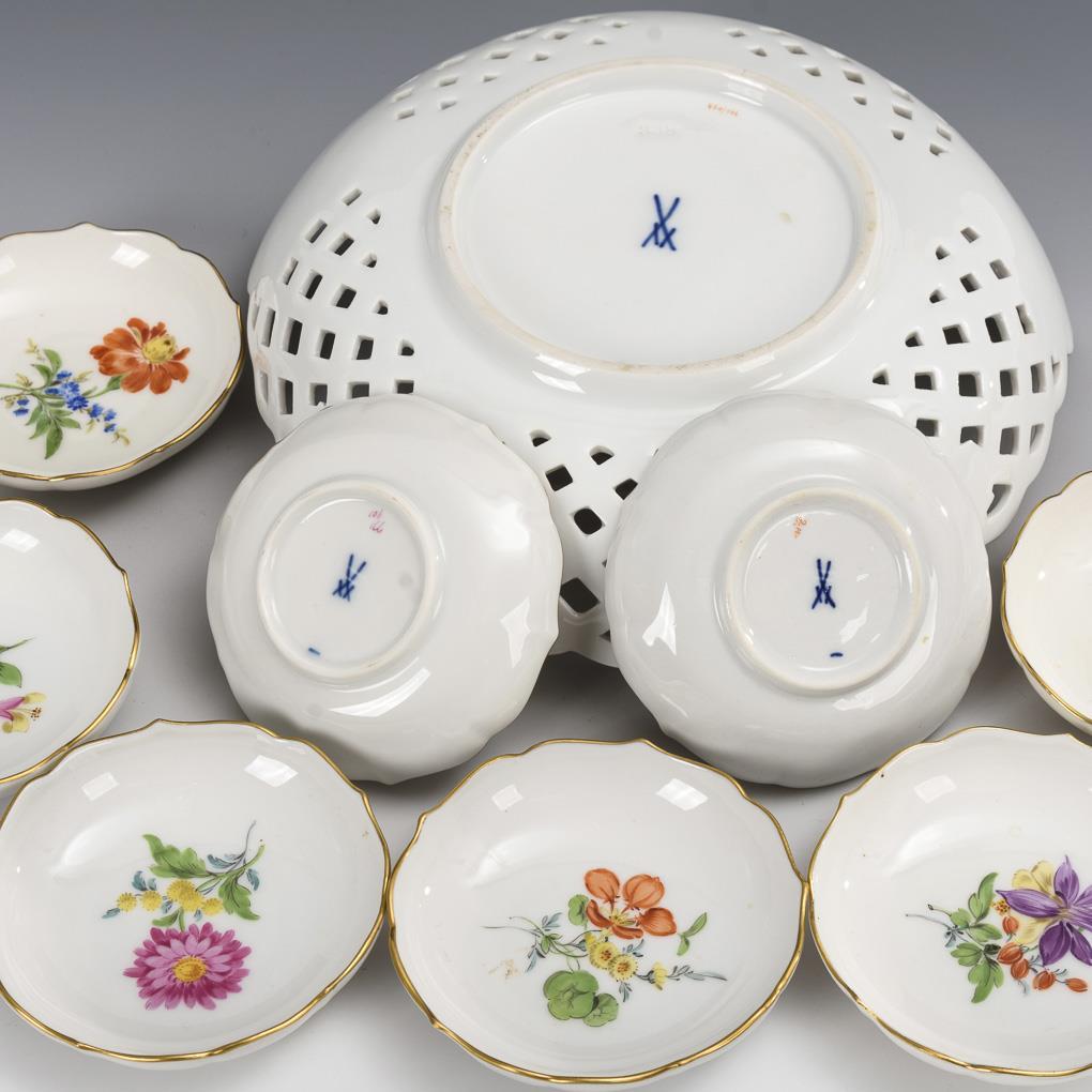 Durchbruchschale und 10 Nussschälchen mit Blumenmalerei. Meissen.