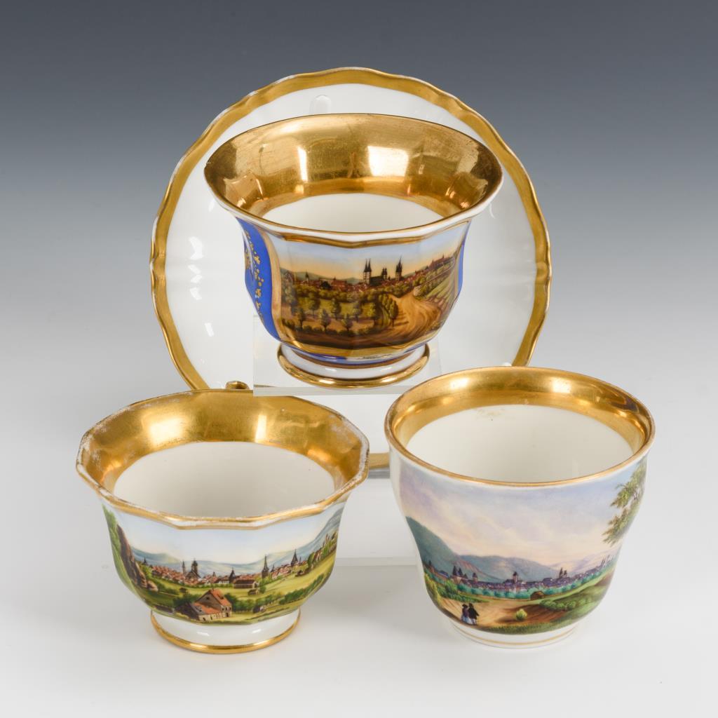 1x Fürstenberg, 1x wohl Althaldensleben und 1x ungemarkt, 1 jüngere Fürstenberg-Untertasse. 2x mit der Ansicht von Goslar, 1x mit der Ansicht der Stadt Halle. Partieller Goldabrieb, 1 Henkel restauriert, 1x mit Randchip.