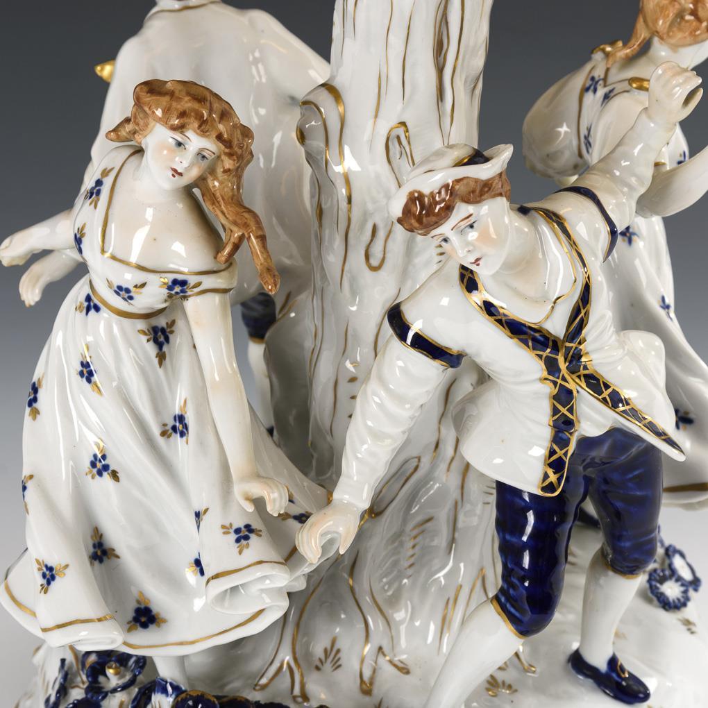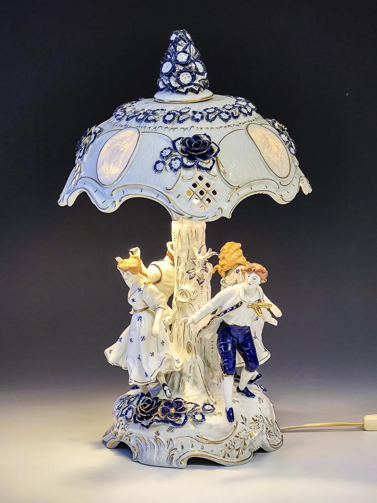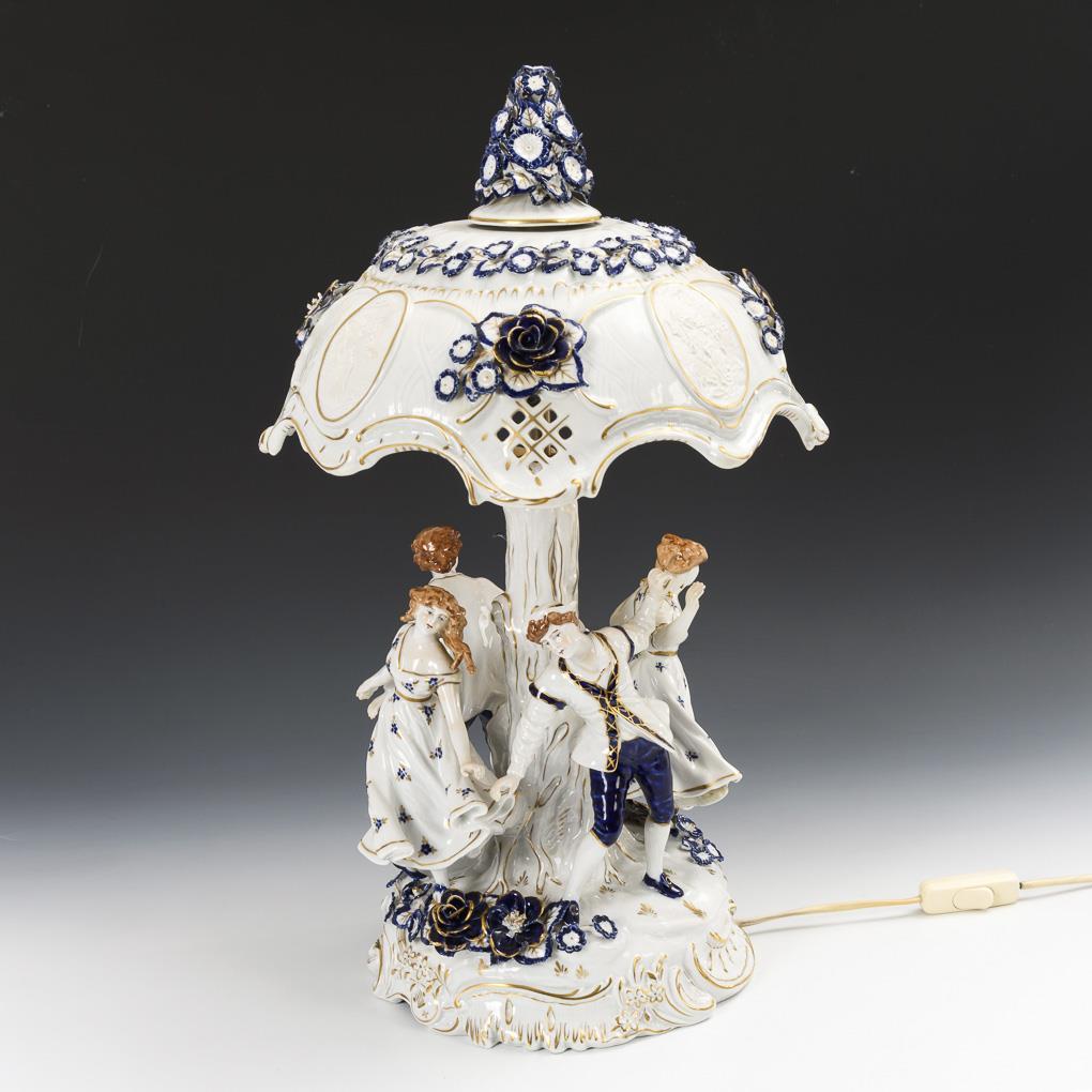 Zwei um einen Baumstamm als Schaft tanzende Paare, rocaillereliefierter, blütenbelegter Lampenschirm mit 4 Lithophaniebildern, blütenbelegter Rocaillefuß. Elektrifiziert (Funktion nicht geprüft). Partiell minimale Bestoßung am Belag.