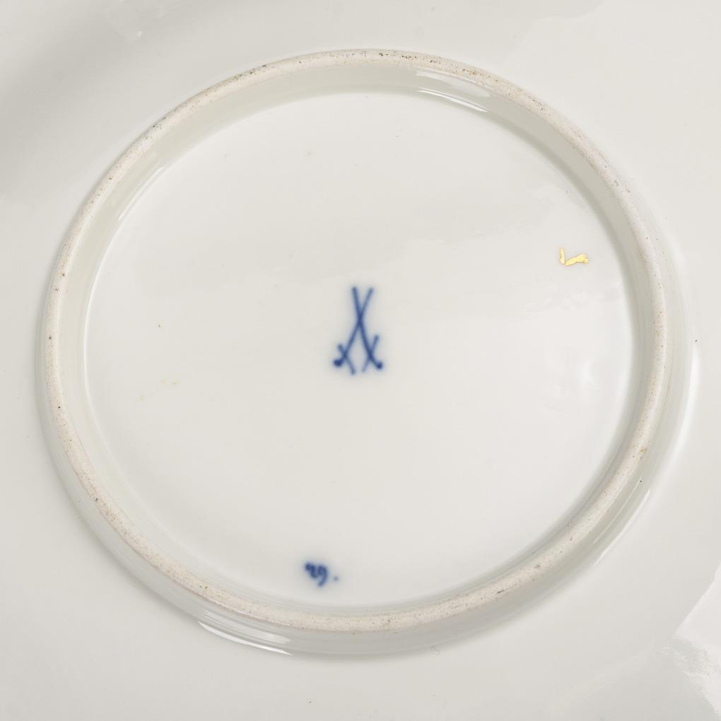 Schale mit muschelreliefierter, kobaltblauer Fahne sowie einem Fruchtbukett im Spiegel und kleinen Fruchtzweigen in drei Rocailleschildern.