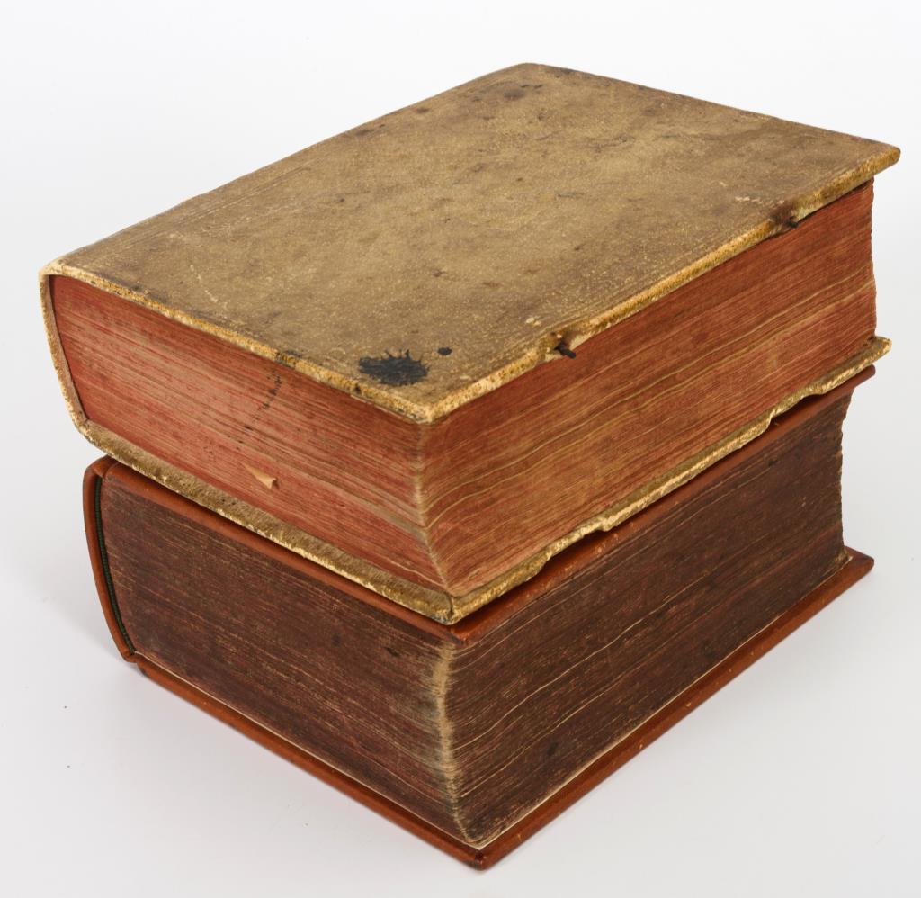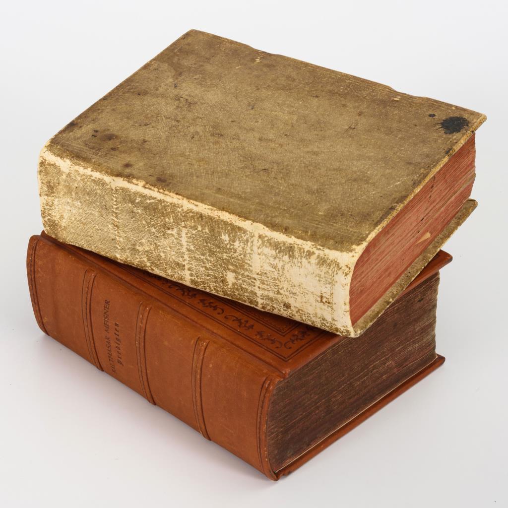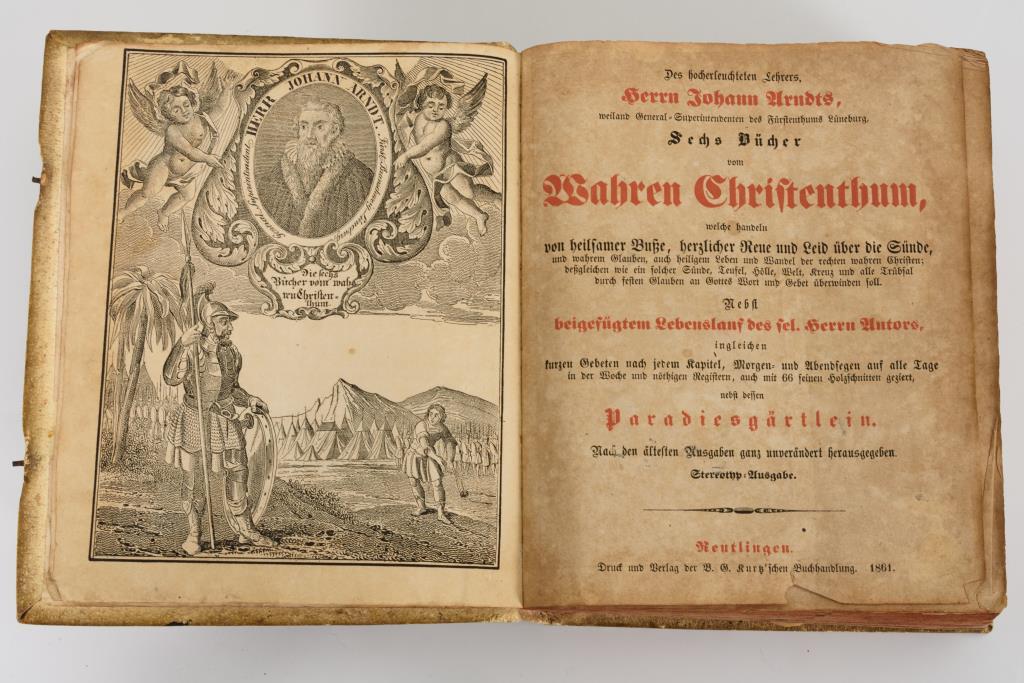 Meißner, Balthasar: "Geistreiche Wolgegründete Predigten Uber das Edle theure Buch der Augspurgischen nun mehr vor Hundert und mehr Jahren ubergebenen Confession. Gehalten zu Wittenberg in der SchloßKirchen im 1618. und folgenden Jahren ..." Frankfurt am Main 1658, bei Balthasar Christoph Wust. 24, 1472, 32 Seiten. Jünger im geprägten Ledereinband nachgebunden. 22 x 18 cm. / "Sechs Bücher vom Wahren Christenthum, welche handeln von heilsamer Buße, herzlicher Reue und Leid über die Sünde ... nebst beigefügtem Lebenslauf des sel. Herrn Autors ... nebst dessen Paradiesgärtlein". Reutlingen 1861, Verlag B .G.Kurtzschen Buchhandlung. Ohne Seitenzählung, mit zahlreichen Illustrationen. Ledereinband, ohne Schließen, 23 x 18 cm.