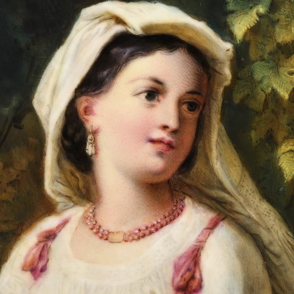 Rechteckige Bildplatte mit der Darstellung einer jungen Italienerin in Tracht, einen Traubenkorb tragend. Verso auf der Platte ein mit Bleistift geschriebener Brief an den/die mit diesem Bild Beschenkte/n.