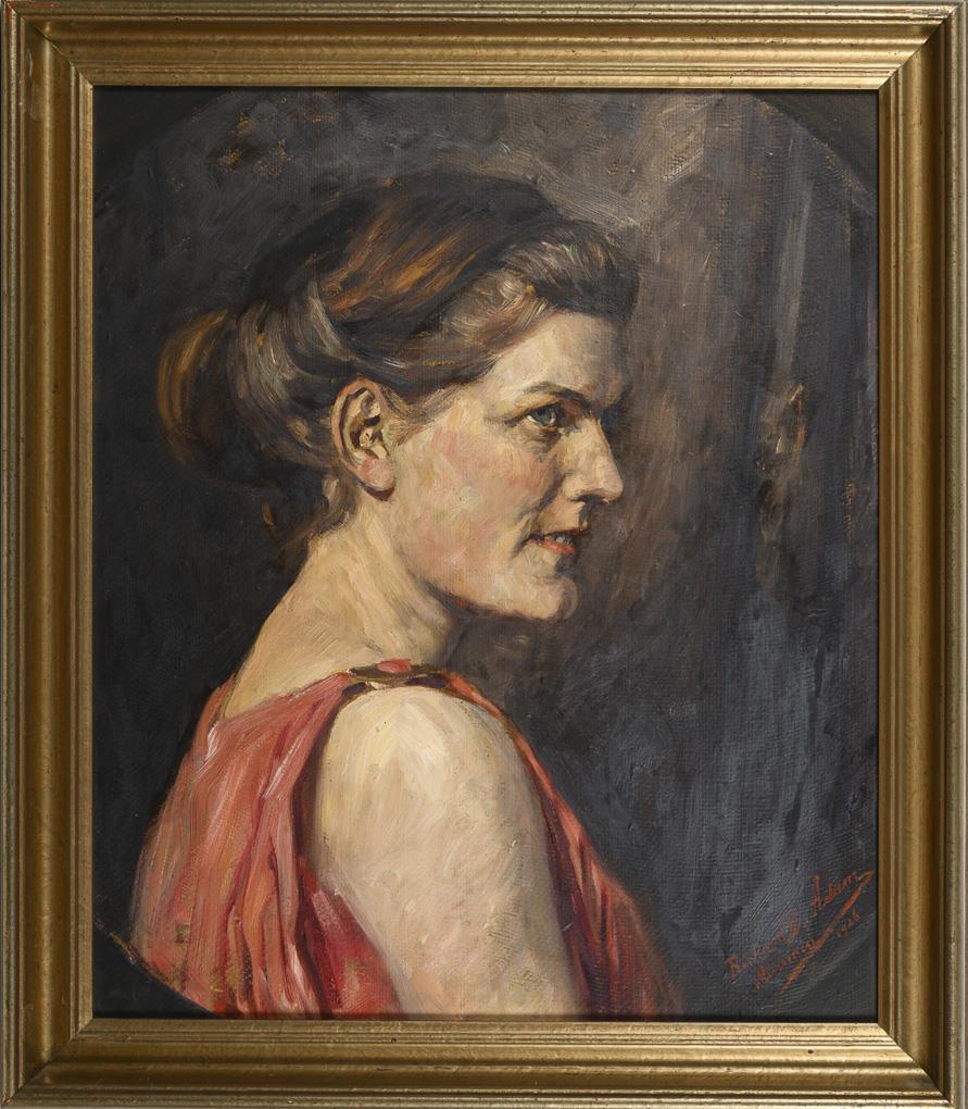 Oval gemaltes Profilbild einer jungen Frau in rötlichem Kleid.