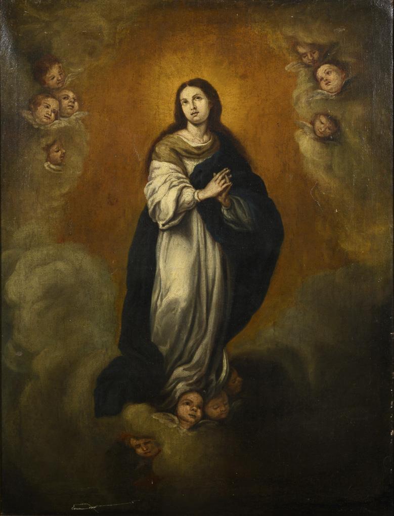 Maria mit Blick nach oben, auf der Mondsichel in den Wolken stehend. Leinwand doubliert, Altersspuren.