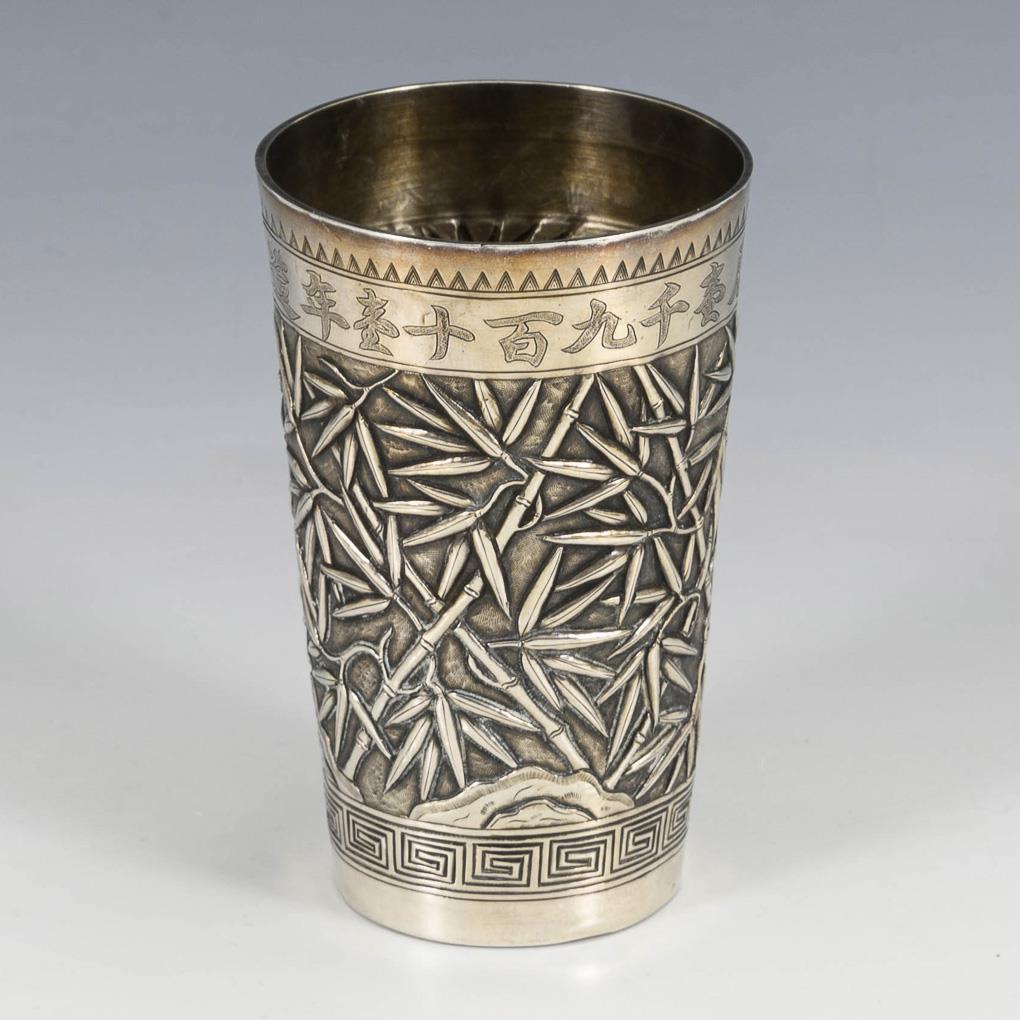 Konischer Becher mit reliefiertem Bambusdekor und umlaufender chinesischer Gravur.