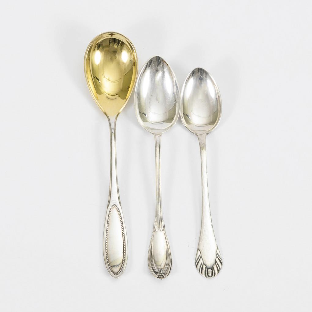 8 Eislöffel mit vergoldeter Laffe, 6 Jugendstil-Kaffeelöffel mit Banddekor und 6 Kopenhagener Mokkalöffel von 1929.