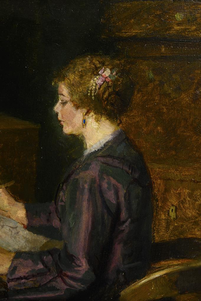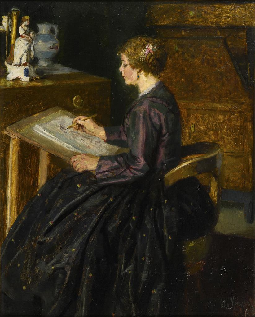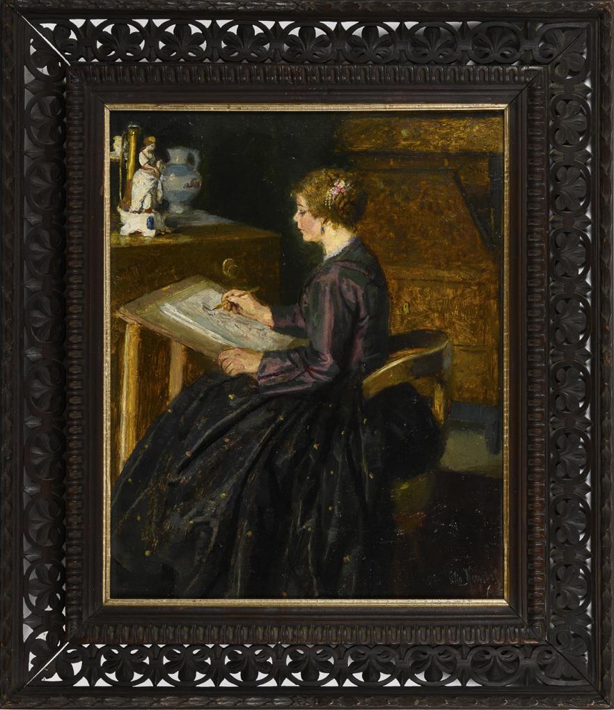 Junge Frau am Zeichentisch beim Erstellen der Vorzeichnung zu einer Porzellanfigur auf der Kommode daneben.