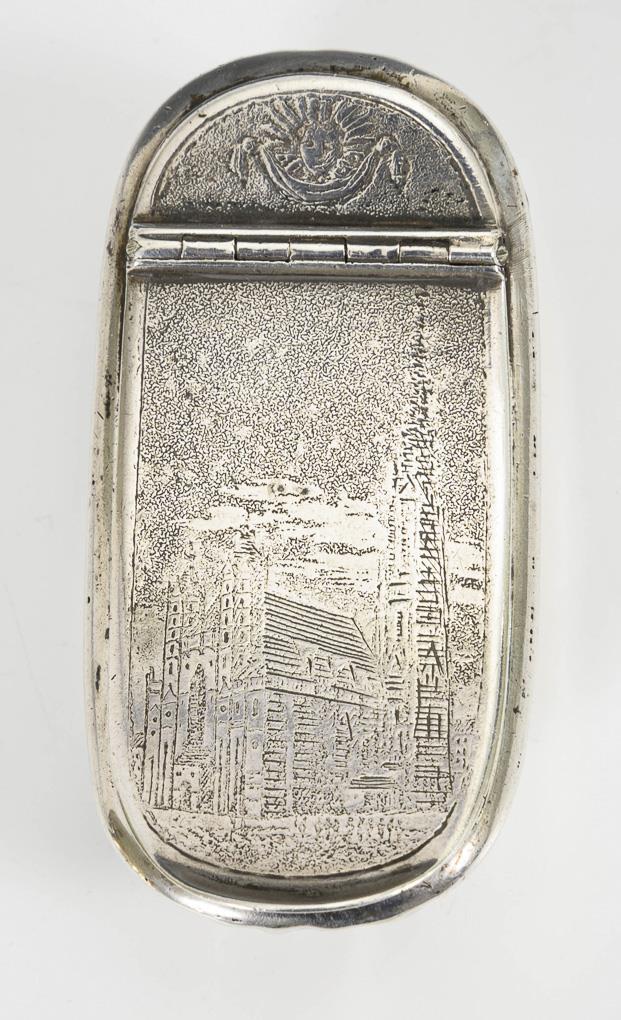 Kleine, gewölbte Dose (18. Jh.) mit gravierter Darstellung einer Kirche auf dem Deckel, 2 x 6,5 x 3,5 cm. / Floral gravierte Dose mit Rocaillenzier, innen vergoldet. 2,5 x 8 x 4,5 cm.