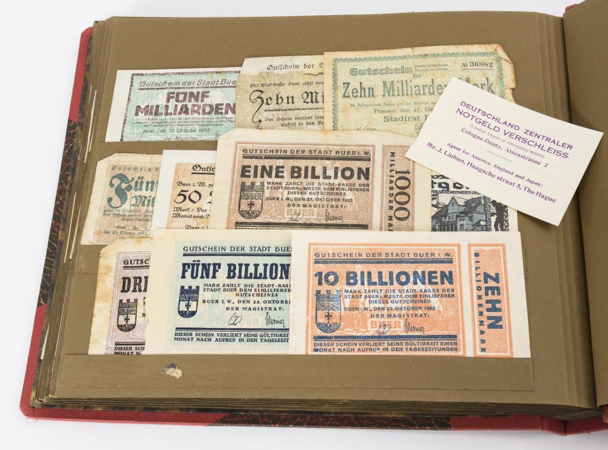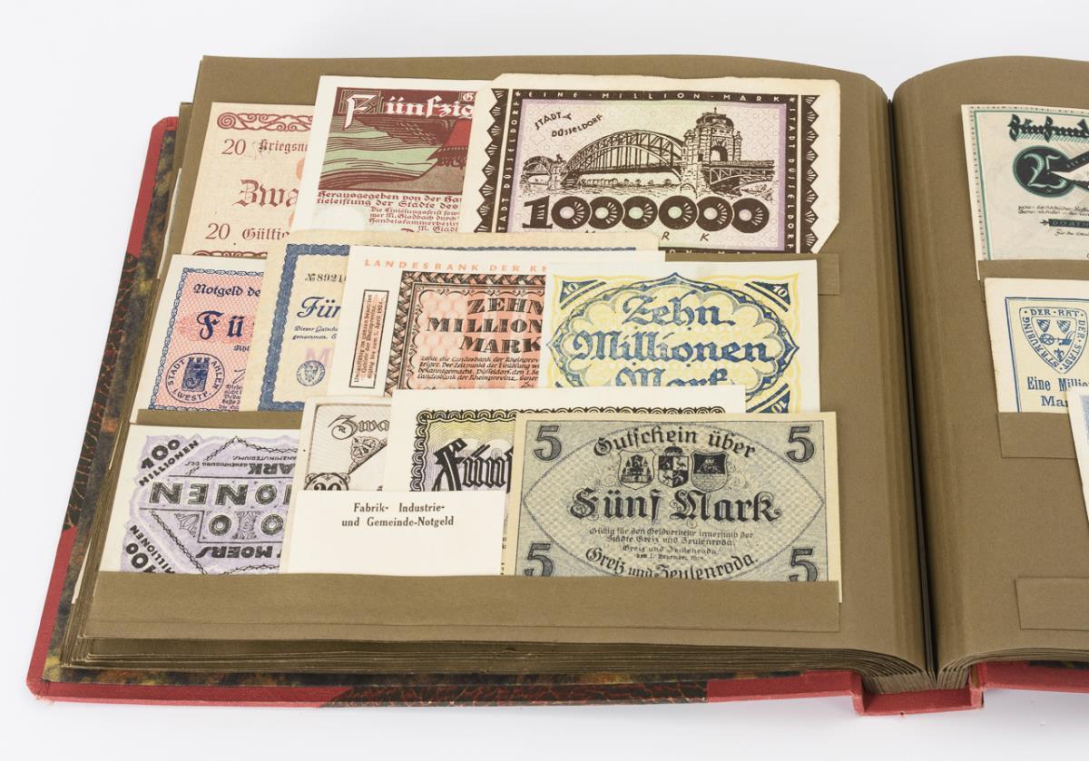 Roter Einband mit Goldprägung: "Notgeld 1915-1924". Reich gestecktes Album mit deutschem und österreichischem Notgeld, Fabrik-, Industrie und Gemeinde-Notgeld sowie deutsches Reichsgeld. Album und die meisten Scheine neuwertig, einige Scheine zerschlissen.