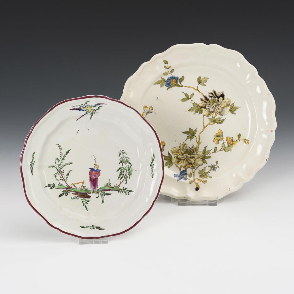 2 barocke Fayence-Teller mit indianischen Blumen und Chinoiserie.