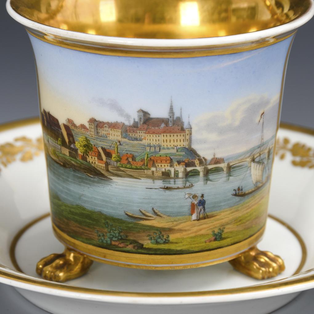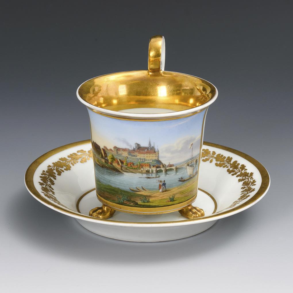 Kratertasse mit drei Tatzenfüßen und hoch geschwungenem Henkel. Schauseitig eine goldgerahmte Rechteckkartusche mit der Ansicht der Albrechtsburg in Meissen. Minimaler Goldabrieb an den Tatzenfüßen.