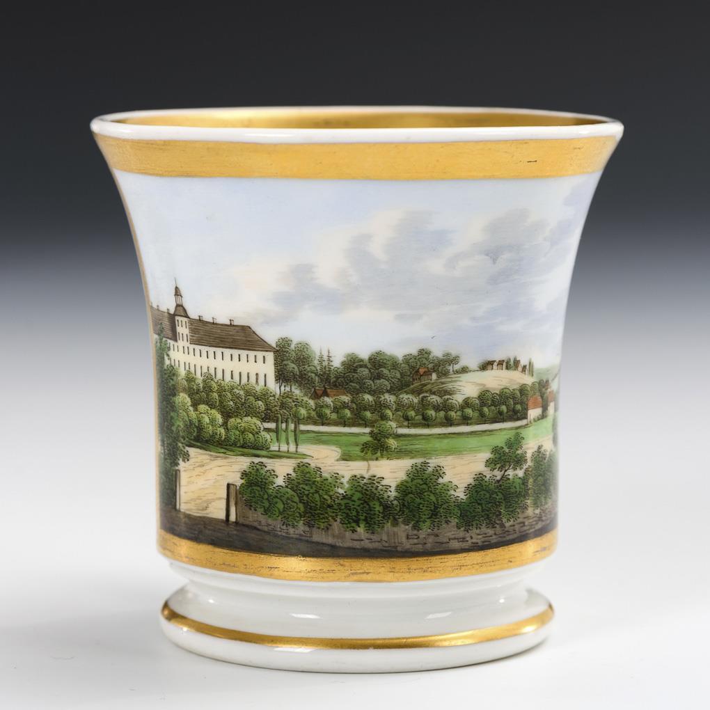 Kleine Kratertasse mit Ohrenhenkel. Schauseitig eine goldgerahmte Rechteckkartusche mit der Ansicht einer Landschaft mit Schloss und Windmühle, verso vegetabile Goldmalerei. Partieller Goldabrieb.