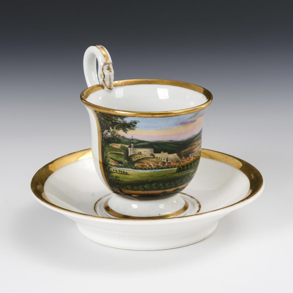 Polychrom bemalt, goldstaffiert. H Tasse 9 cm, Ø ergänzte Untertasse 14 cm.