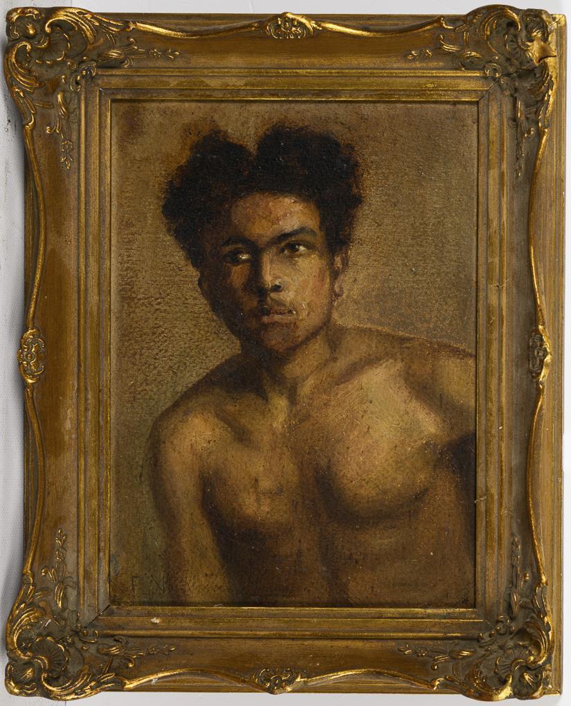 Porträt eines nackten jungen Mannes vor neutralem Hintergrund. Altersspuren.