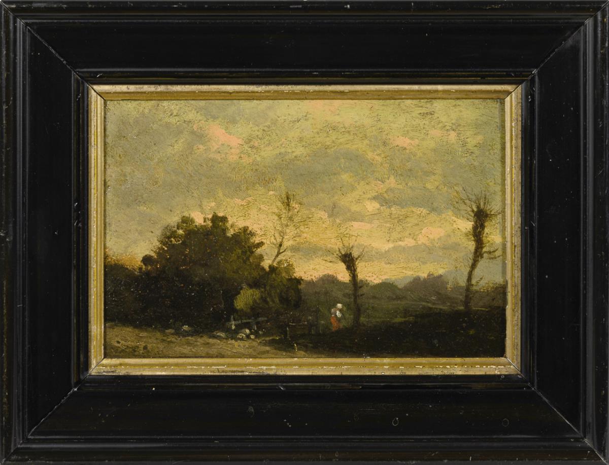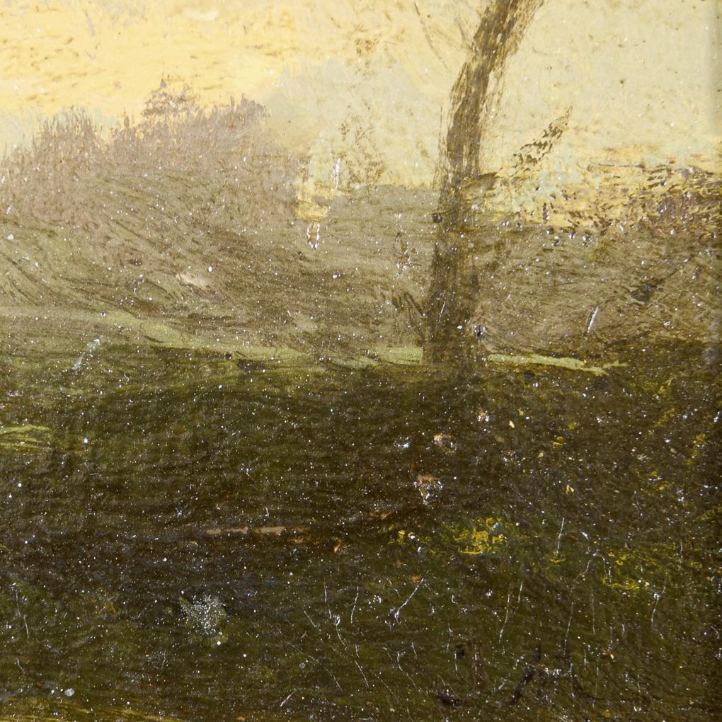 Stimmungsvolle Landschaft mit Brücke und Staffage, welches an die Schule von Barbizon erinnert. Leichte Altersspuren.