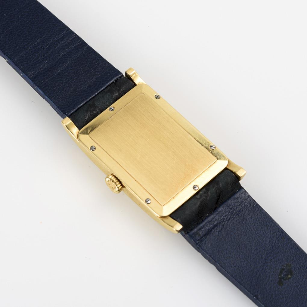 Rechteckiges Gehäuse mit weißem Emailzifferblatt und Stundenmarkierungen im Minutenkranz, kleiner Sekunde und Blattzeigern. An schwarzblauem Lederband mit goldener IWC-Dornschließe, L ca. 22,5 cm.