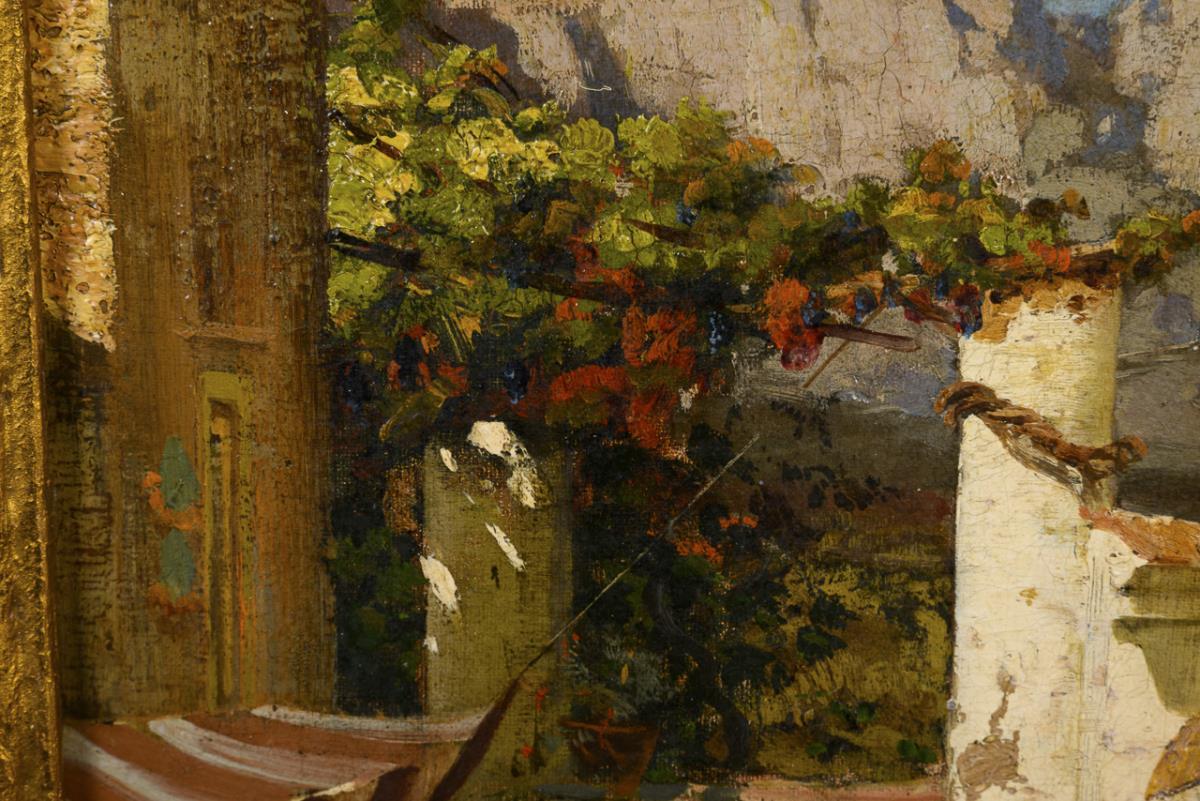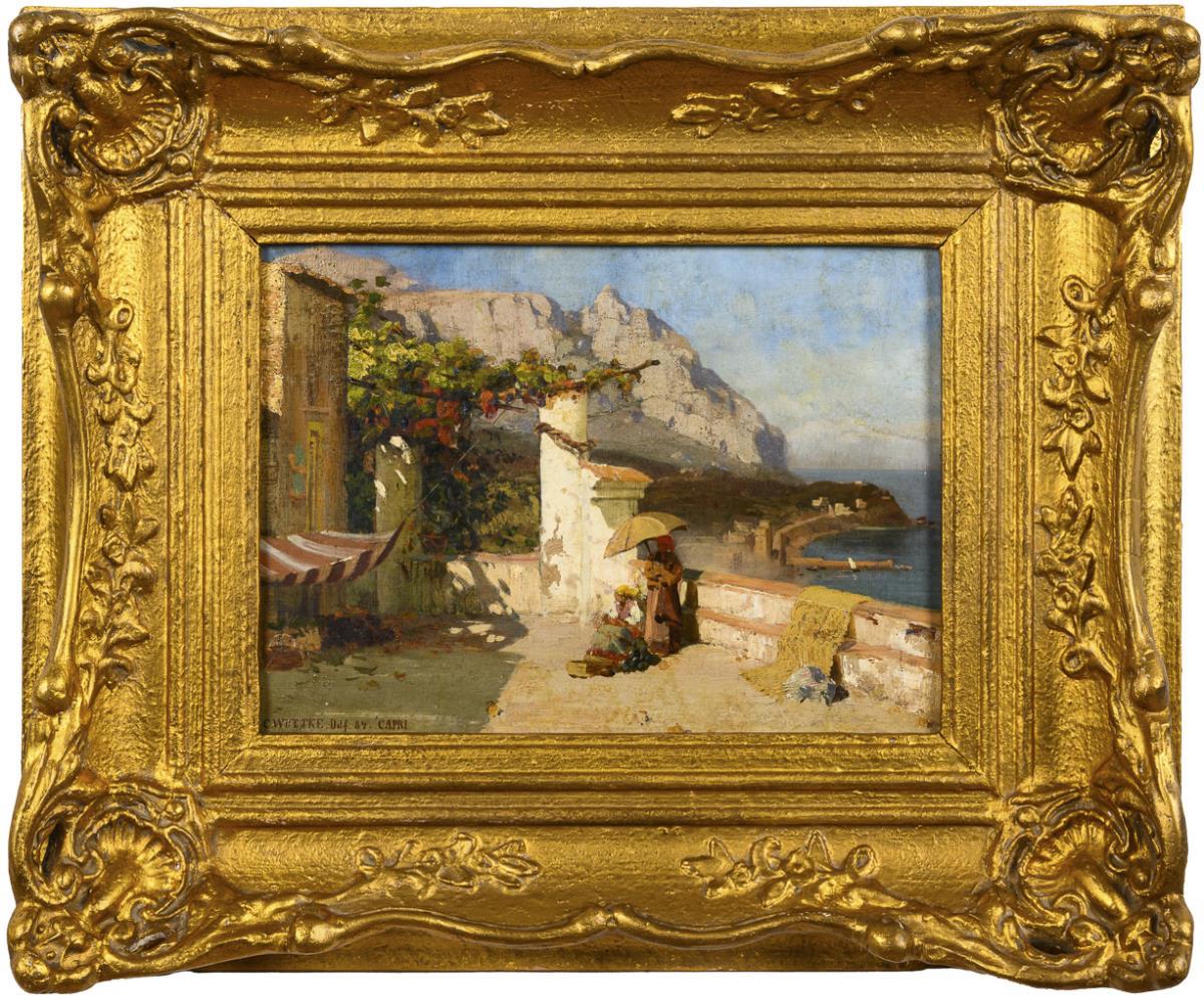 Öl/Leinwand. Links unten signiert mit Zusatz Düsseldorf und Capri, verso italienische Widmung des Künstlers von 1884 "Dediccitte alla Signorina Erminia Sondermann, Ddf. [...] 1884 C. Wuttke". (18)84.