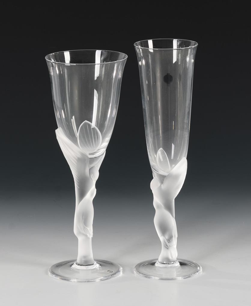 Kuppa aus farblosem Glas, Stängel aus farblosem, formgepresstem Glas in Gestalt zweier, sich küssender Tauben. 1x mit Randbestoßung.