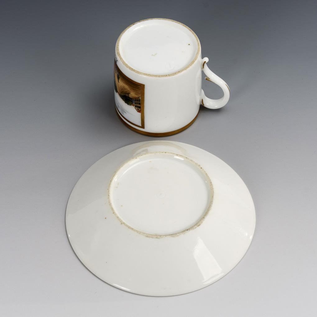 Polychrom bemalt, goldstaffiert. H Tasse 6 cm, Ø Untertasse 12,5 cm.