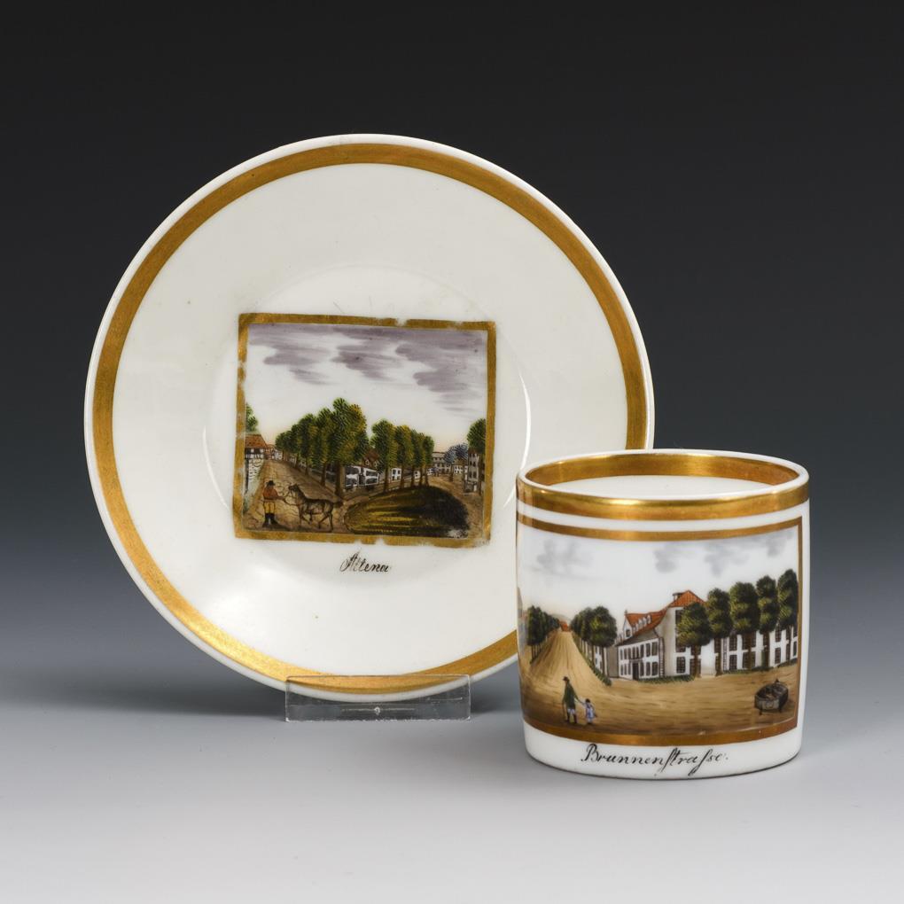 Zylindertasse mit Ohrenhenkel. Schauseitig eine goldgerahmte Rechteckkartusche mit der Darstellung einer Straßenansicht, bezeichnet "Brunnenstraße". Im Spiegel der Untertasse eine Rechteckkartusche mit einer bezeichneten Ansicht einer Straße in Altena im Sauerland. Minimaler Goldabrieb.