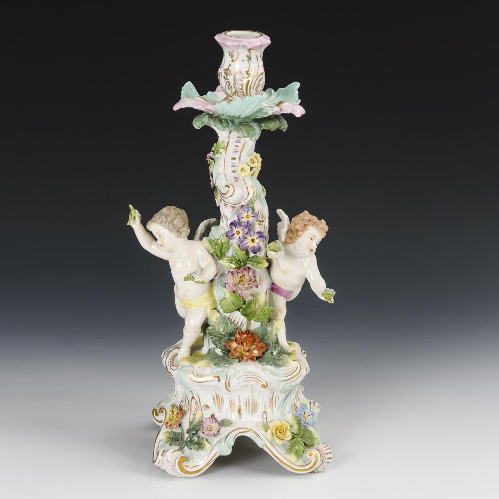 1-flammiger Rocailleleuchter mit zwei am Schaft stehenden Putten und reichem Blütenbelag. 1 Blüte restauriert.
