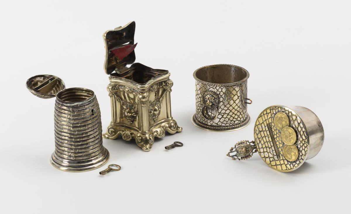 Reich ornamentiertes Postament in Barock-Form. Bienenstock. Trommelförmige Dose mit Schlangenhaut-Optik, Ringhandhaben an Löwenköpfen, Engelsflüchte-Haspe sowie 3 applizierte "Georgstaler" auf dem Passdeckel; innenliegend ein Vorhängeschloss mit Schlüssel. Einige Alters-/Gebrauchsspuren, 1 Schloss schließt nicht, Vorhängeschloss defekt.