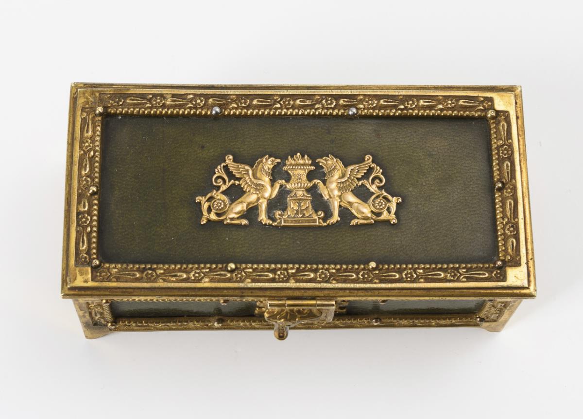 In der Art von Erhard & Söhne ägytisierend gestaltete Schatulle mit reichem Reliefornament und appliziertem Greifenpaar auf dem Scharnierdeckel. Minimale Alters-/Gebrauchsspuren.