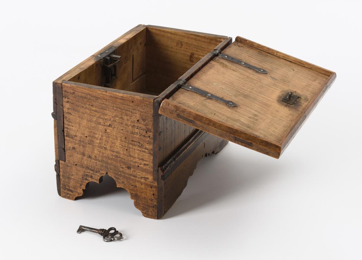 Geriegeltes Ahorn massiv, Eiche-Intarsien, Eisen. 15,5 x 24,5 x 14 cm.
