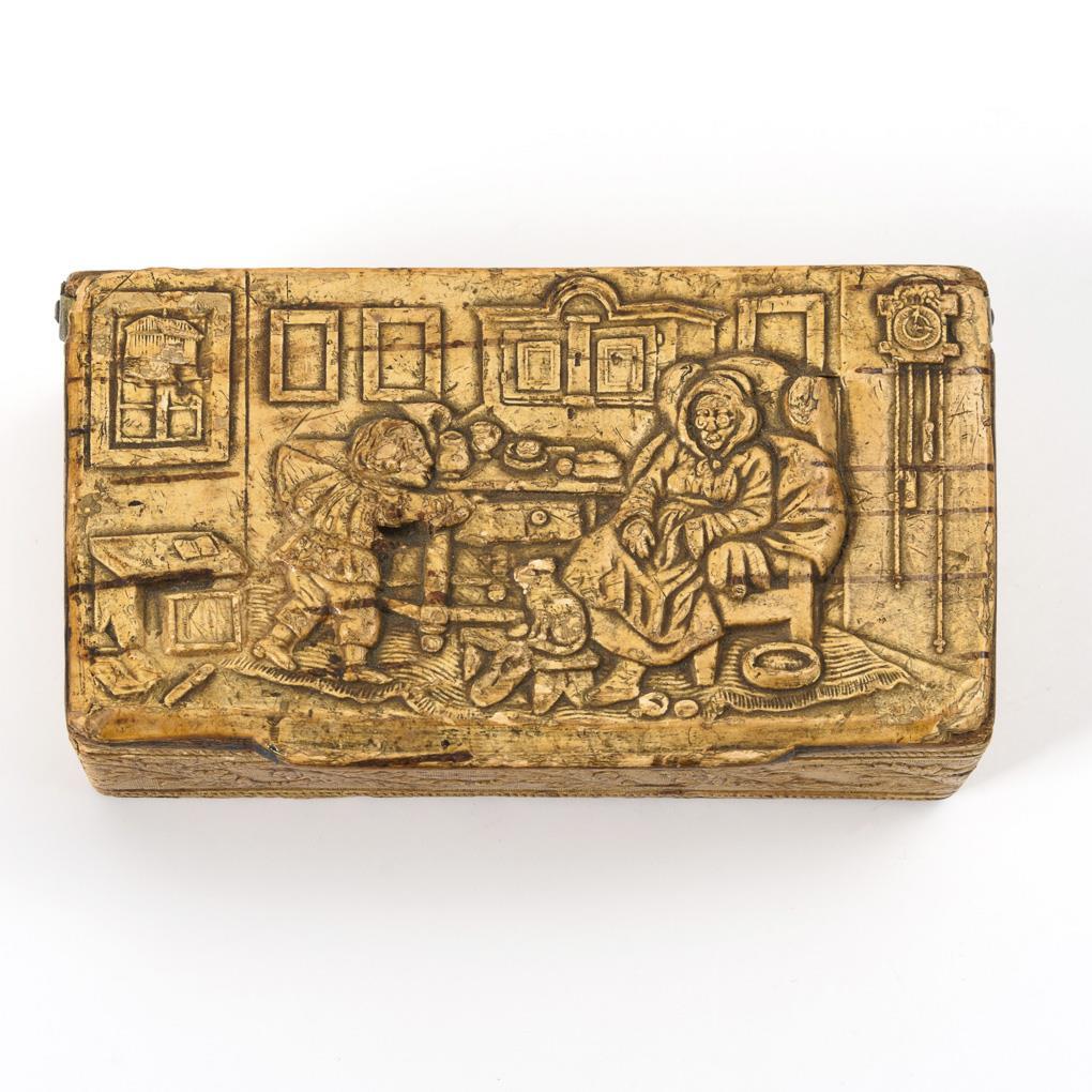 Quaderschatulle allseits und innen mit Birkenrinde furniert. Auf dem Scharnierdeckel Genreszene: Im Sessel schlafende Großmutter und aus der Schublade etwas klaubender Bursche. Einige Furnier-Fehlstellen, Alters-/Gebrauchsspuren.