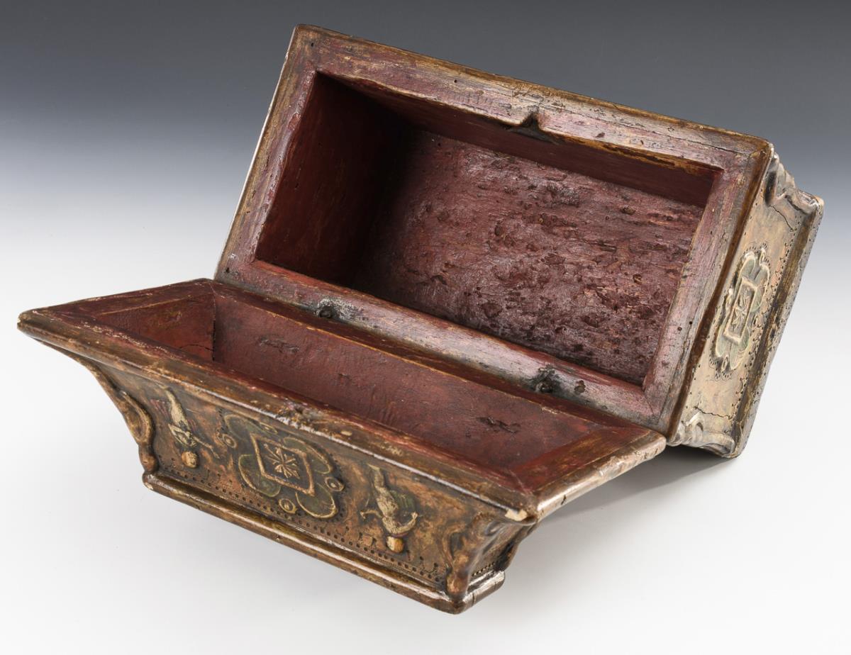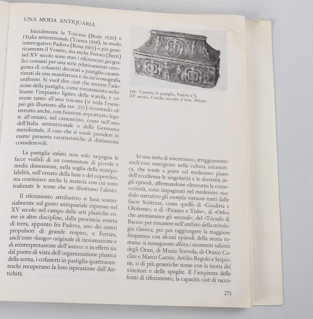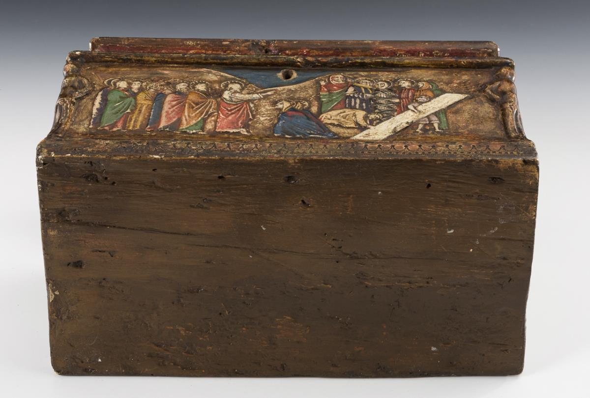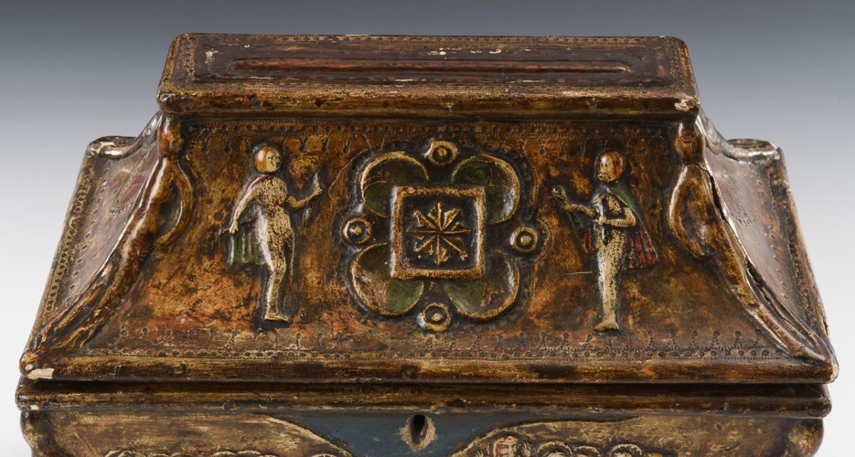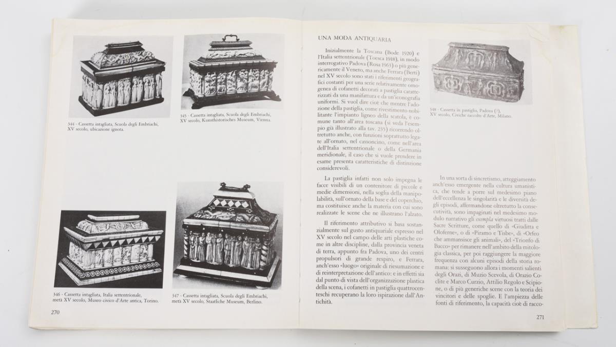 Literatur : Eine ähnliche Schatulle befindet sich in den Städtischen Kunstsammlungen von Mailand und wird dort ins 15. Jh. datiert. Abgebildet im Ausstellungskatalog Tra/E, Galleria Lorenzelli, Bergamo 1984, S. 271, Abb. 348.
