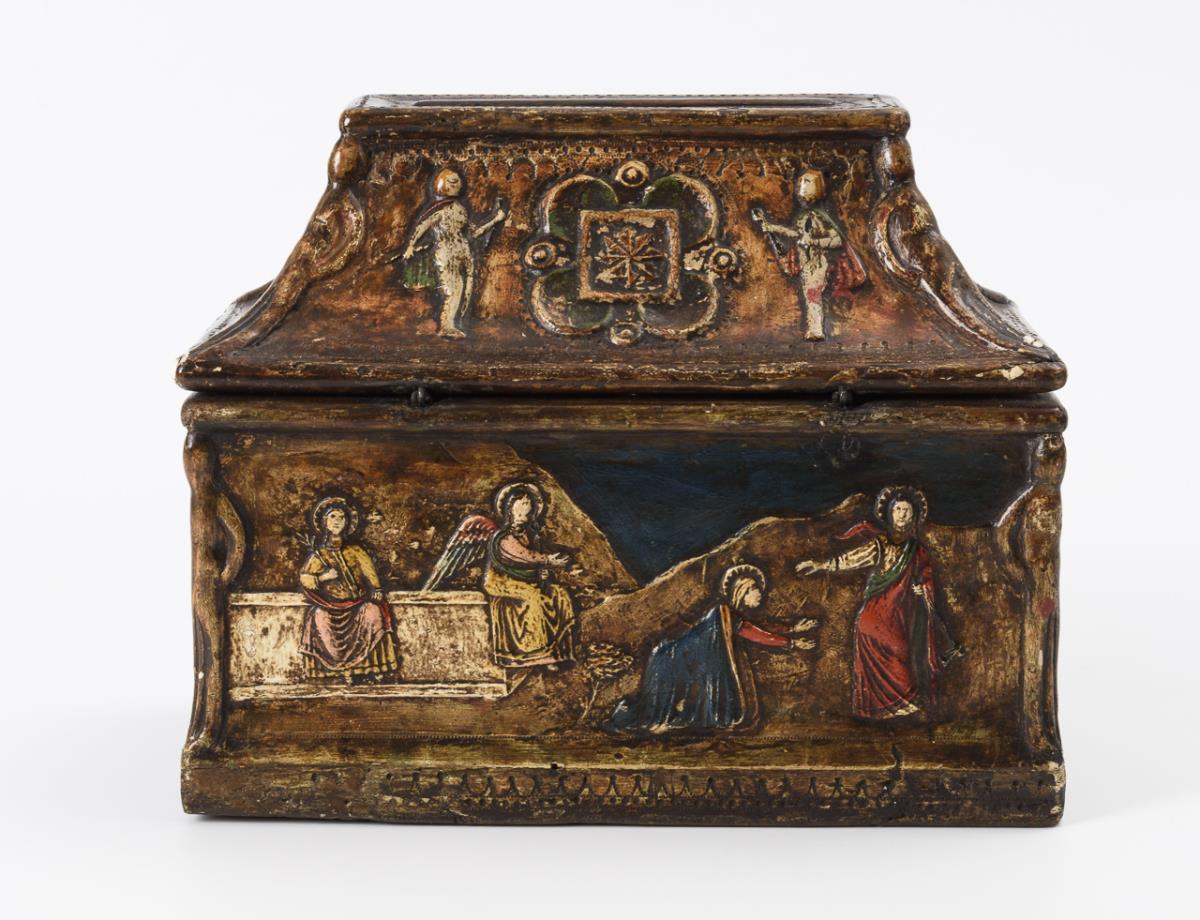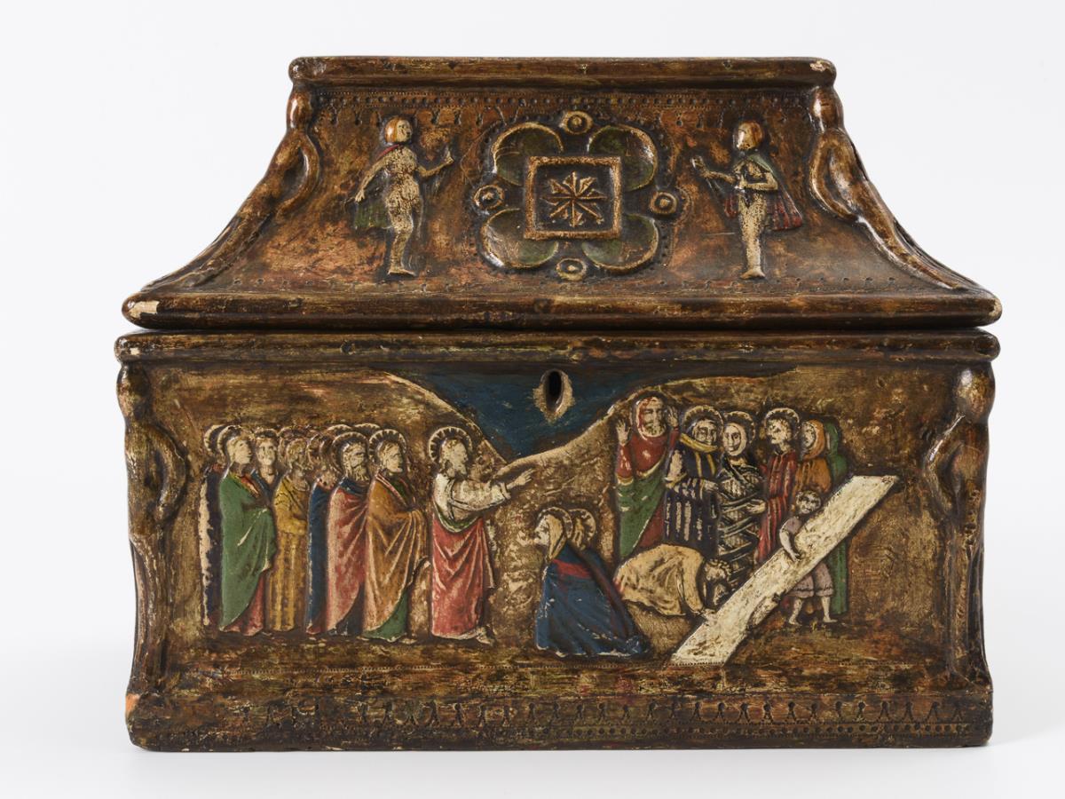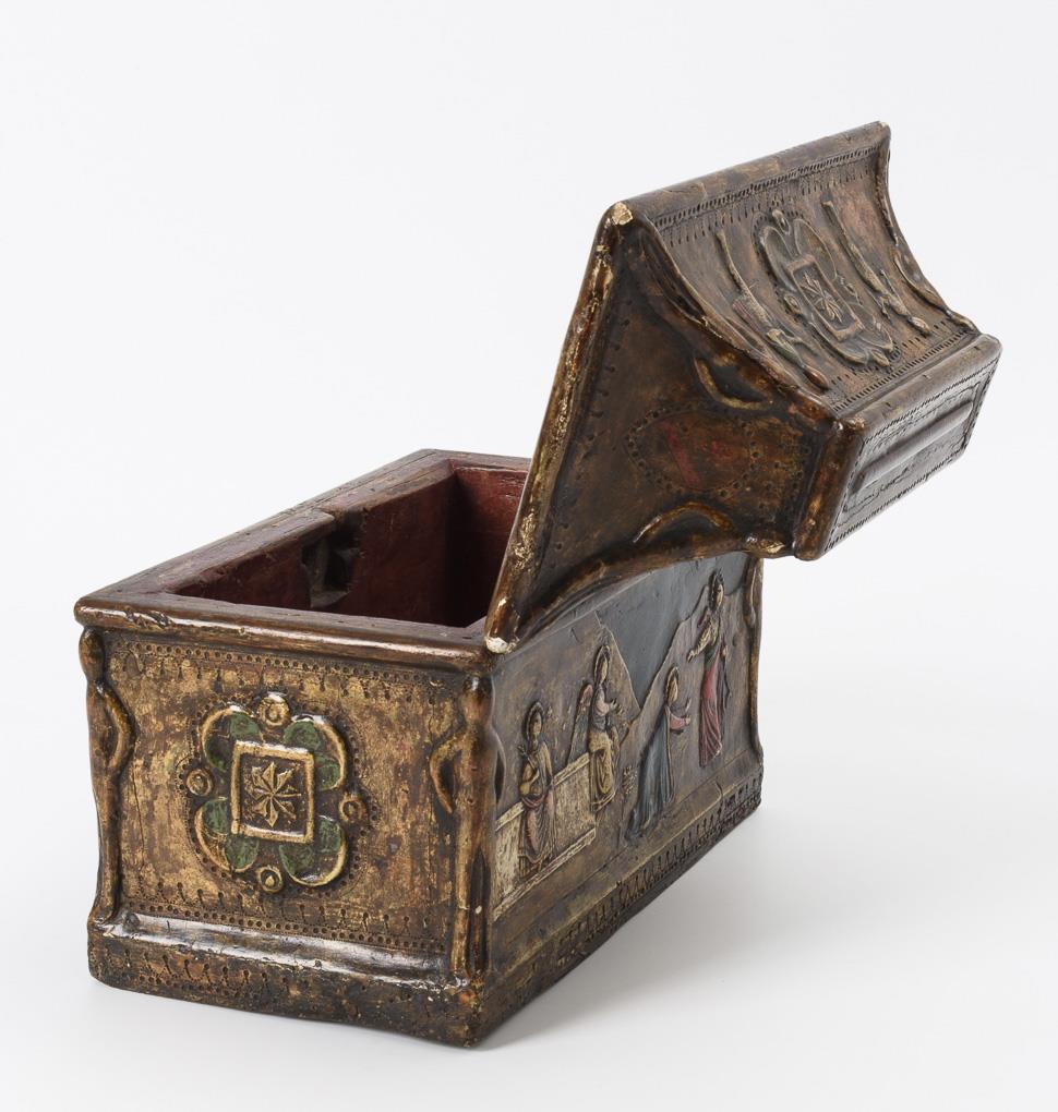 Quaderförmiger Cofanetto mit dachförmigem Scharnierdeckel. Allseits und auf dem Deckel mit Stuckreliefs verziert: Auf den Längsseiten Szenen nach Giotto aus der Scrovegni (Arena) Kapelle: Erweckung des Lazarus bzw. Noli me tangere. Auf den Stirnseiten Vierpässe mit Rosetten; diese ebenfalls zentral auf den Deckel-Längsseiten; hier mit flankierenden Personen (Engel mit Arma Christi?). Die Deckel-Stirnseiten je mit Rossstirnschild-Wappen: Doppellilie über Schräglinksbalken. Alters-/Gebrauchsspuren, teils retuschiert.