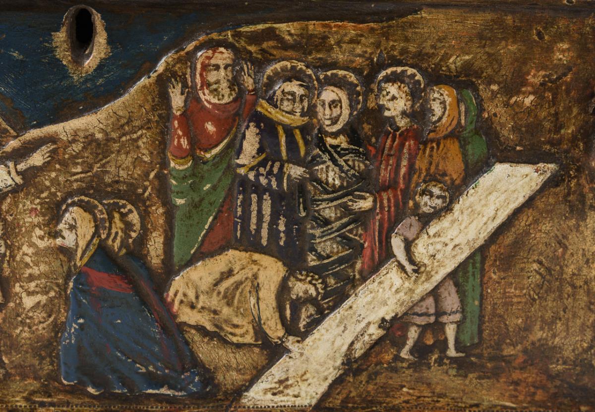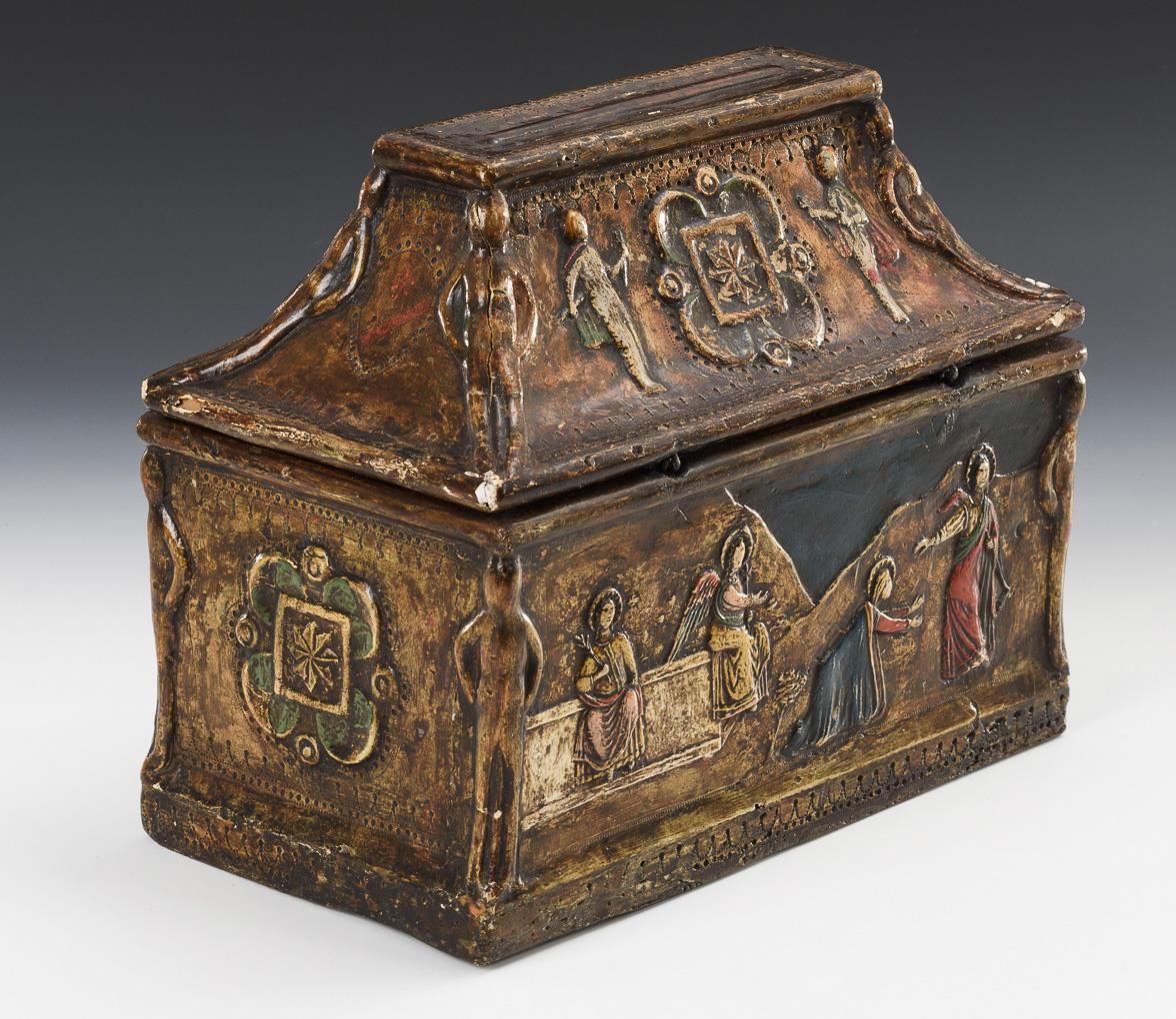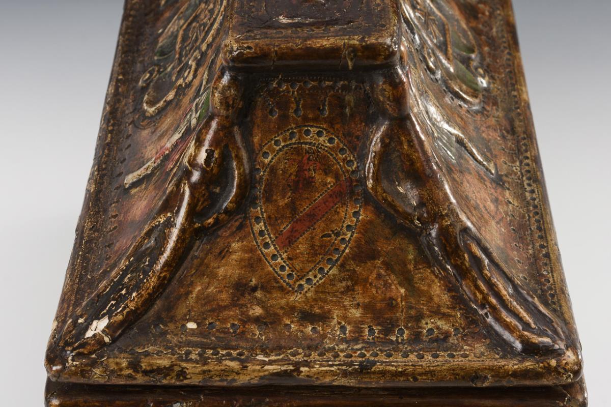 Quaderförmiger Cofanetto mit dachförmigem Scharnierdeckel. Allseits und auf dem Deckel mit Stuckreliefs verziert: Auf den Längsseiten Szenen nach Giotto aus der Scrovegni (Arena) Kapelle: Erweckung des Lazarus bzw. Noli me tangere. Auf den Stirnseiten Vierpässe mit Rosetten; diese ebenfalls zentral auf den Deckel-Längsseiten; hier mit flankierenden Personen (Engel mit Arma Christi?). Die Deckel-Stirnseiten je mit Rossstirnschild-Wappen: Doppellilie über Schräglinksbalken. Alters-/Gebrauchsspuren, teils retuschiert.