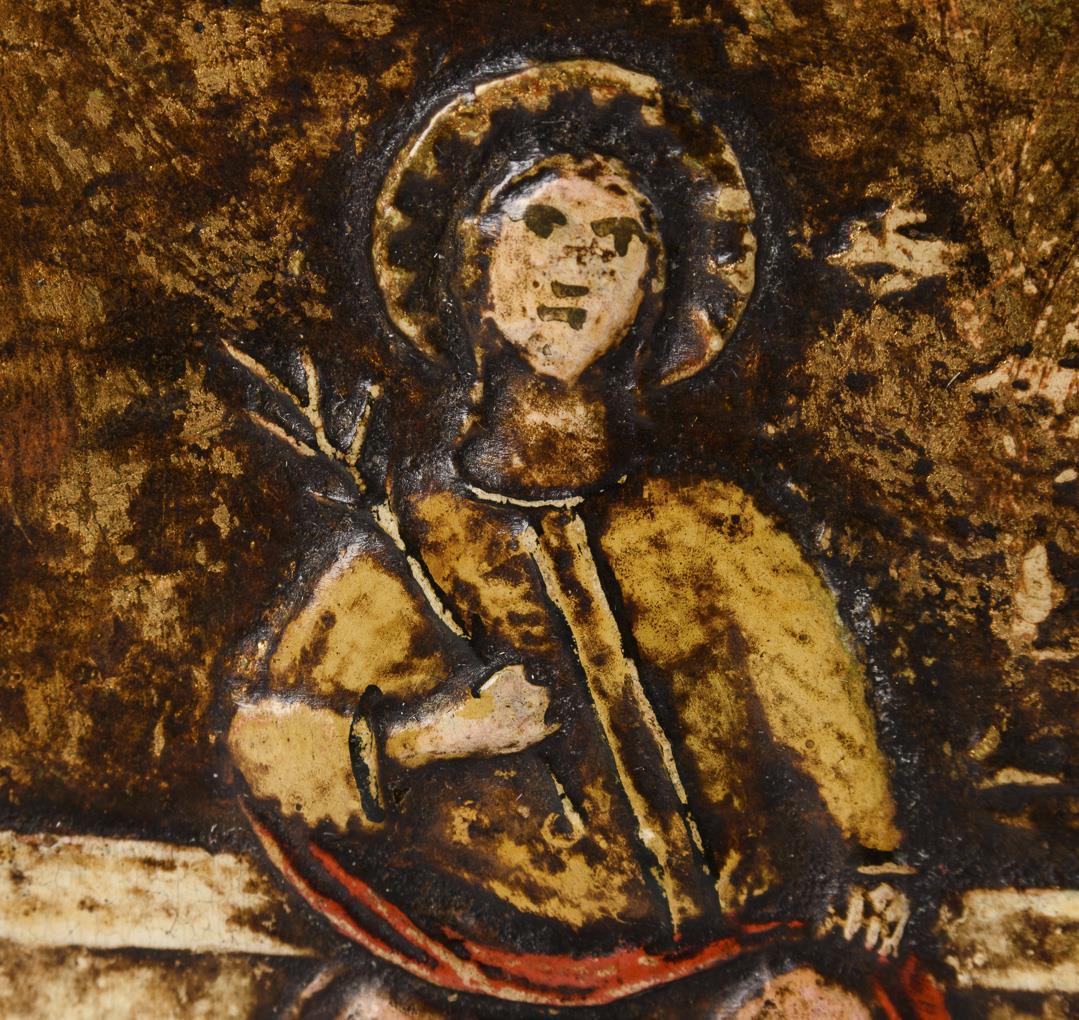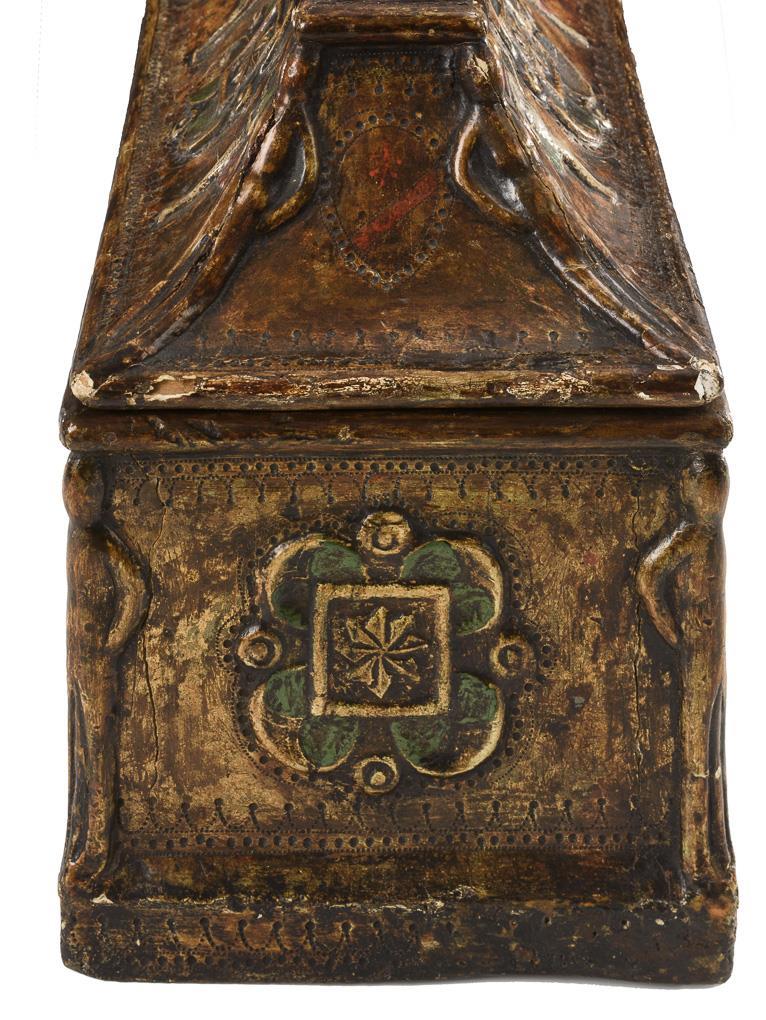 Holz stuckiert, reliefiert und gepunzt, polychrom bemalt. 26 x 32,5 x 18 cm.