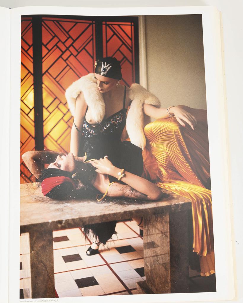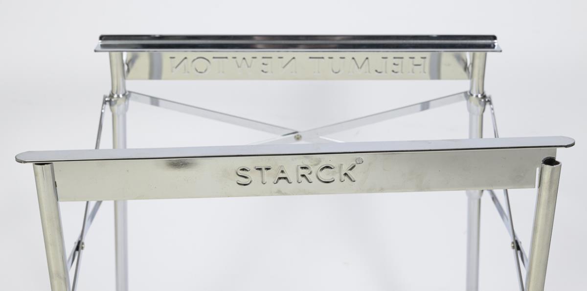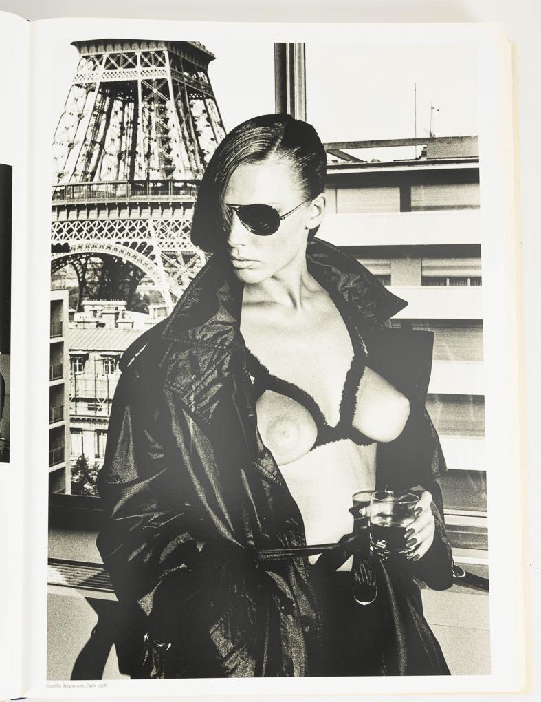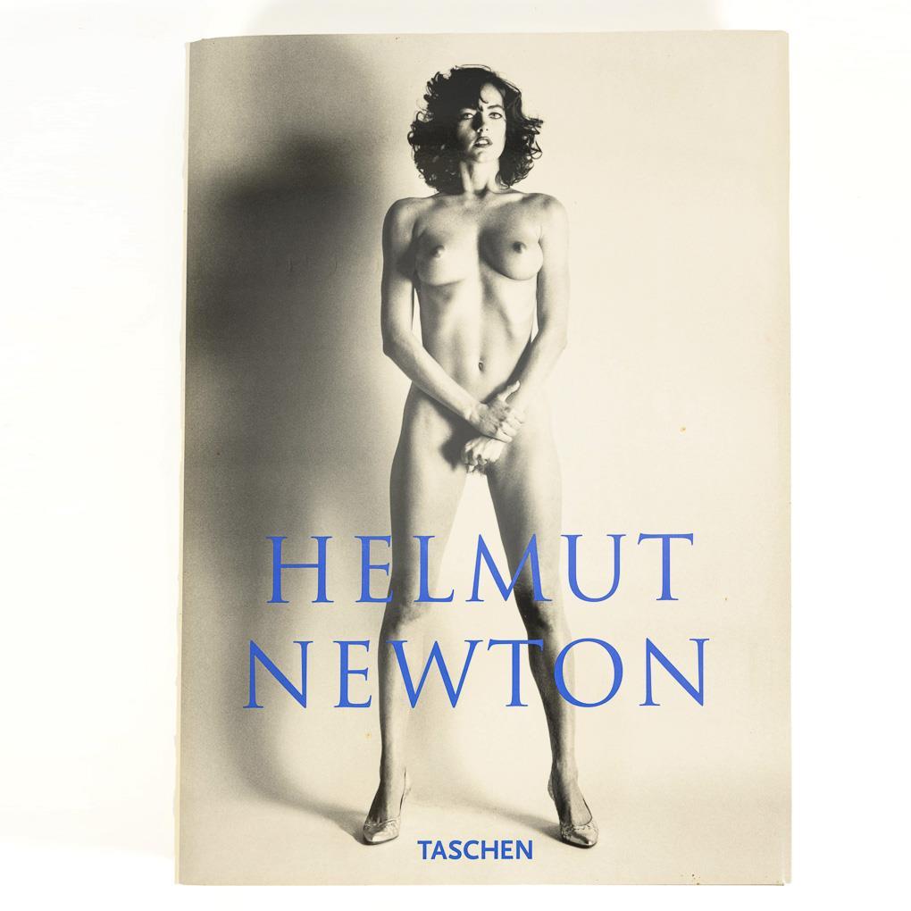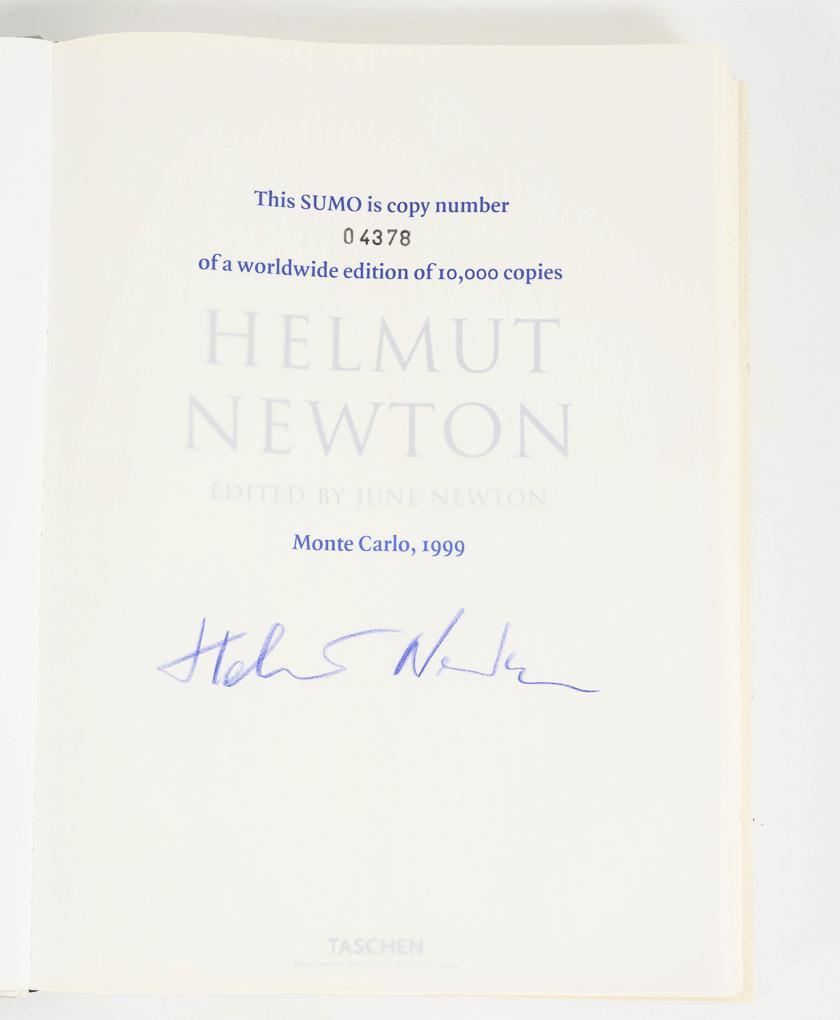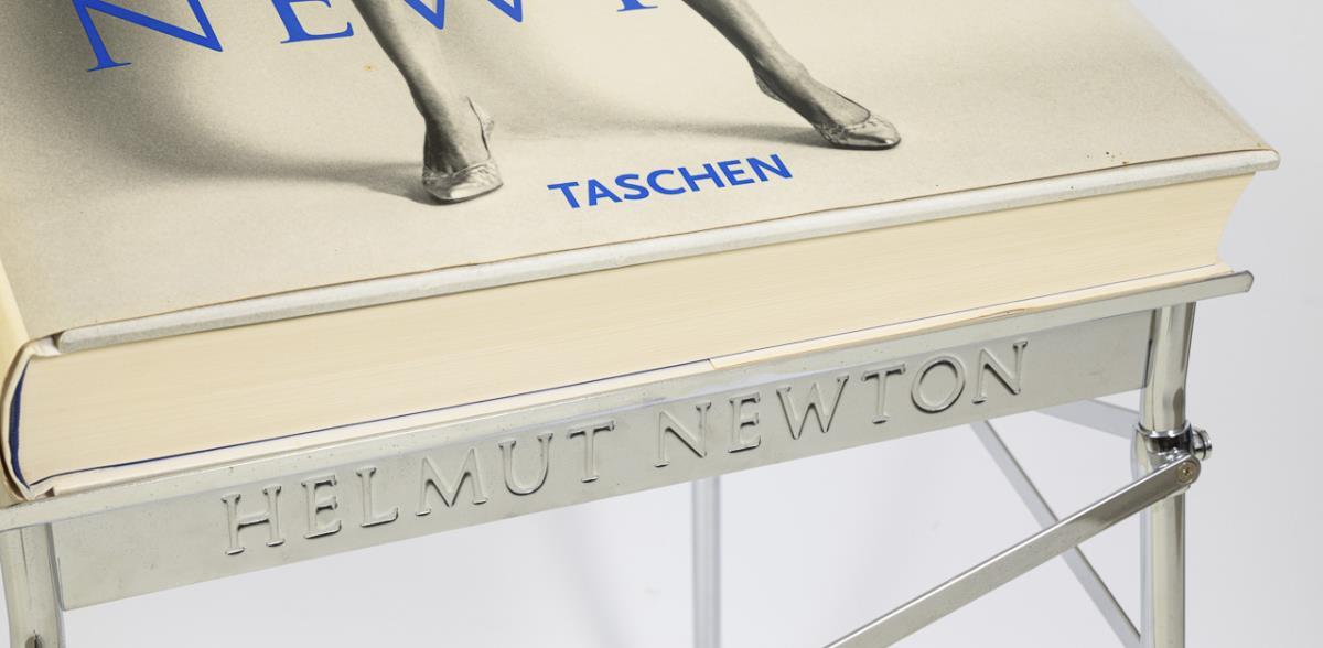 Sehr großer Fotobildband. Hrsg. von June Newton, nummeriert 4378/10000 und handsigniert von Helmut Newton. Fester Einband mit Schutzumschlag. Dazugehöriges verchromtes, klappbares Gestell von Philippe Starck entworfen. Auf den Auflageteilen vorn 'Helmut Newton' und rückseitig 'Starck' beschriftet. Im Originalkarton. Zustand neuwertig mit sehr schwachen Nutzungsspuren auf dem Schutzumschlag hinten.