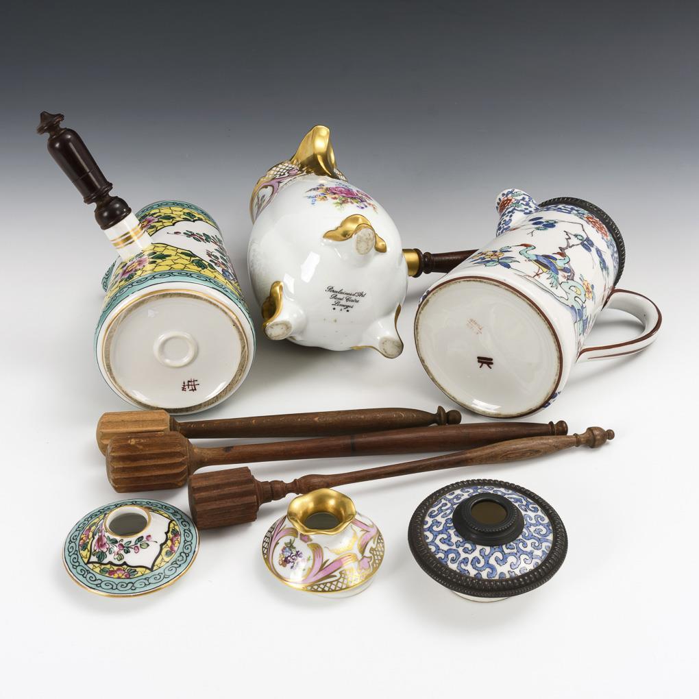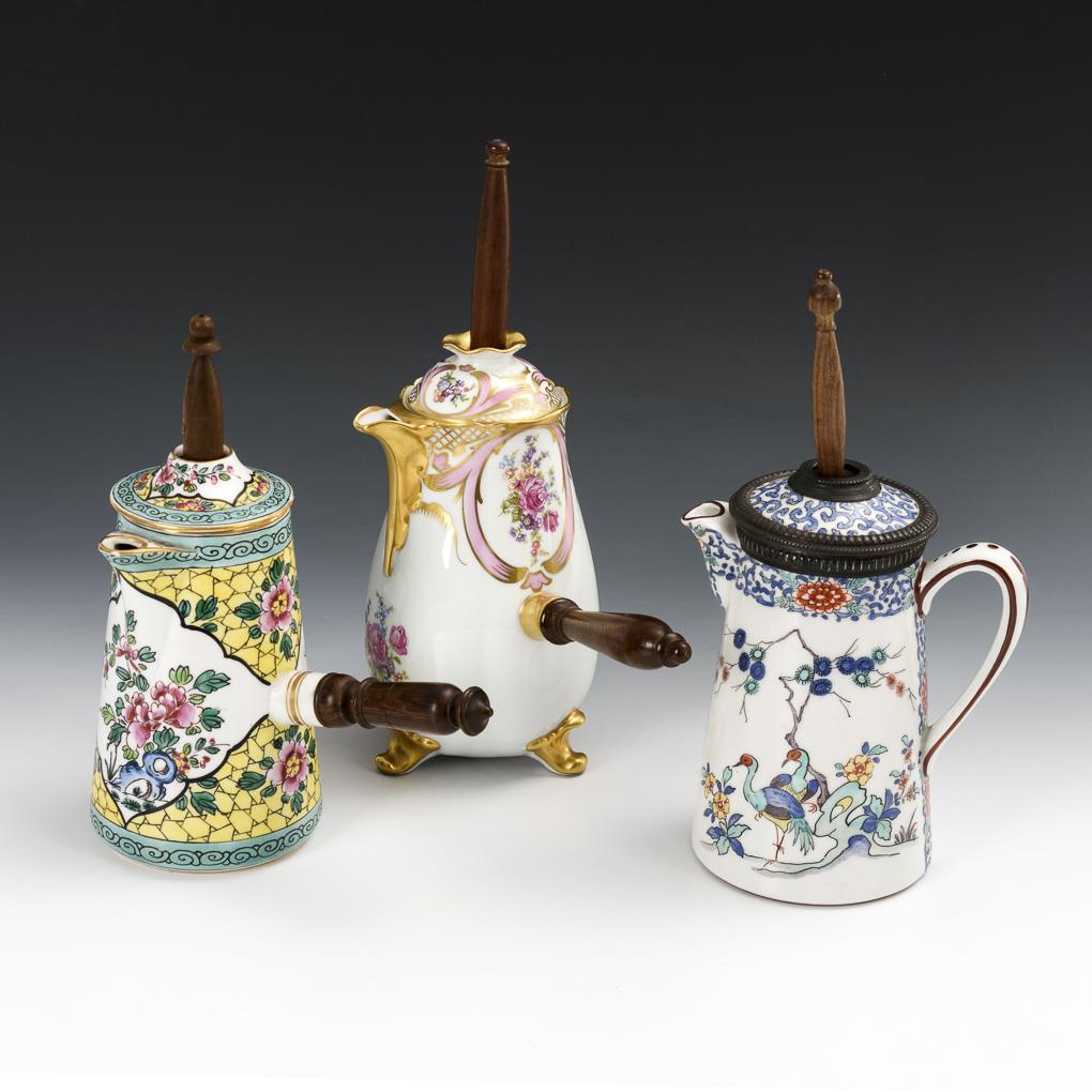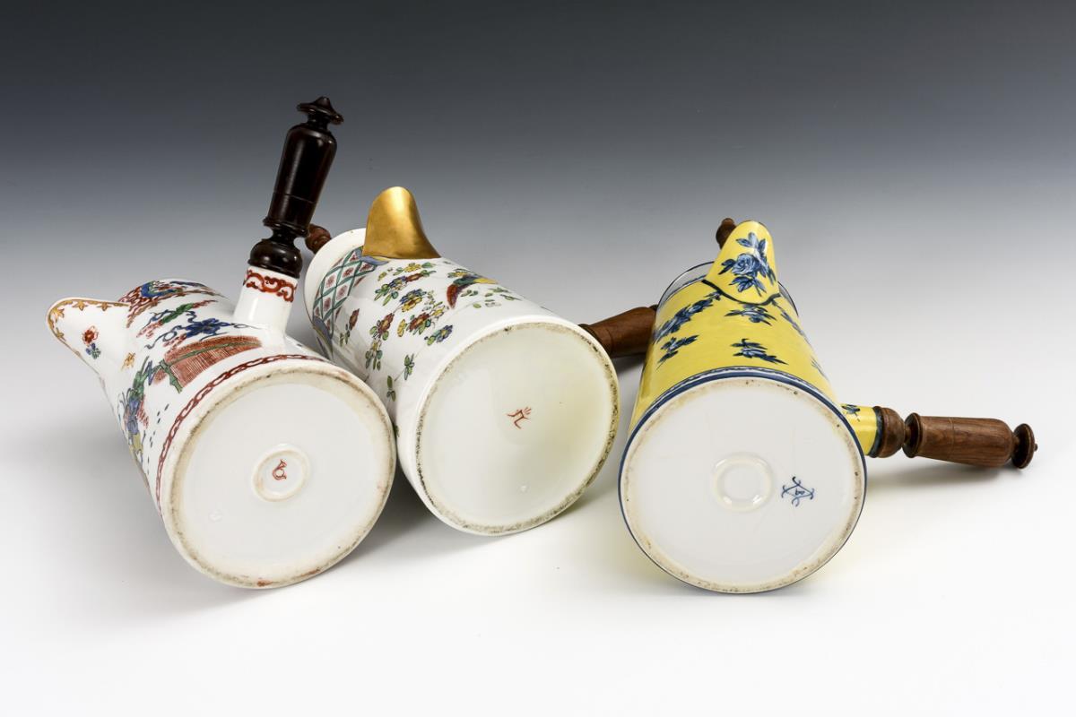 Überwiegend konische Kannen mit überwiegend seitlichem Holzgriff und Deckel mit Öffnung für den Quirl. 4x mit asiatischem Dekor, 1x mit gelbem Fond und blauen Rosenfestons und 1x mit Blumenmalerei. Mit 5 Holzquirlen. 2x Haarrissspinne im Boden, 1x geklebter Chip am Deckel, 1x Deckelnase bestoßen.