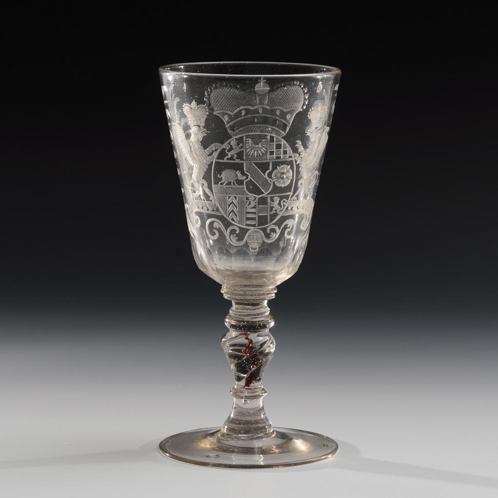 Konische, am Ansatz facettierte Kuppa, tordierter Balusterschaft mit eingeschmolzenem Rubinglasfaden, Rundfuß; Abriss. Schauseitig unter einem Kurhut das gravierte, von zwei Greifen gehaltene und von Palmwedeln gerahmte Wappenschild des Markgrafen Karl III. Wilhelm von Baden-Durlach (1679-1738).
