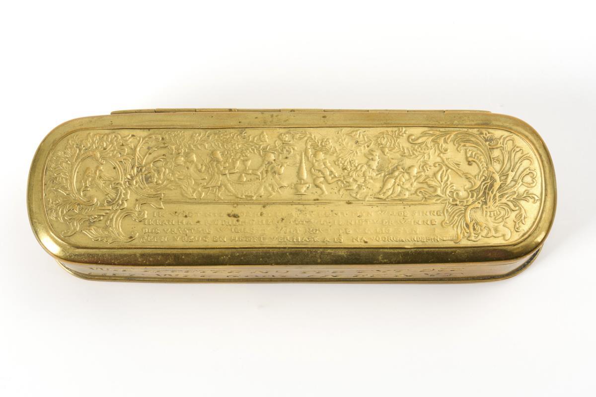 Messing, Deckel und Boden geprägt, Wandung graviert. 3 x 16,5 x 5 cm.