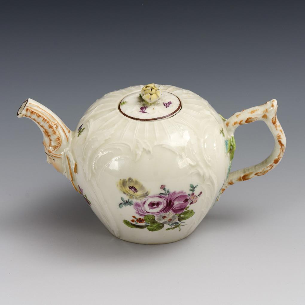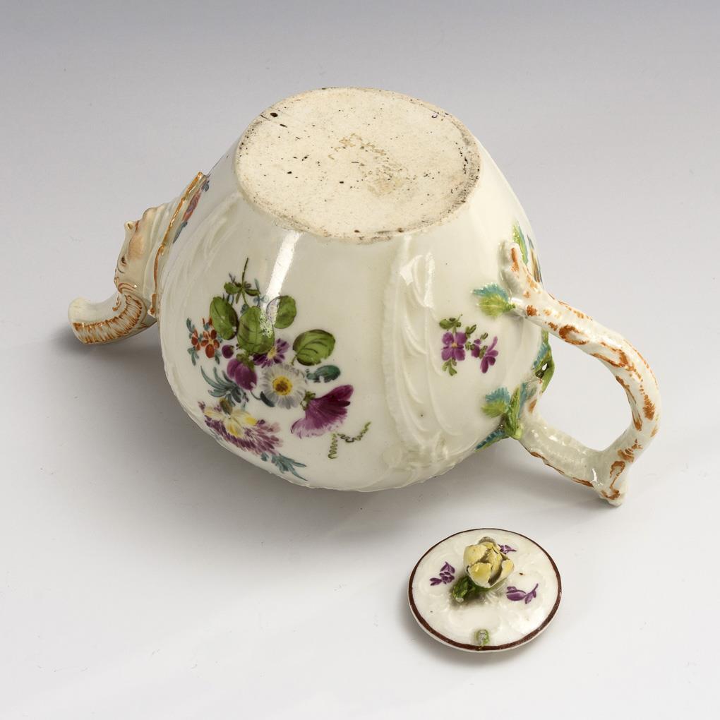 Modell "Reliefzierat". Kännchen mit Rocaillehenkel, Maskaron-Röhrenausguß und ergänztem Blütenknaufdeckel. Beidseitig ein Blumenbukett zwischen Streublümchen. Blütenknauf, Nase des Maskarons und Schneppe bestoßen.