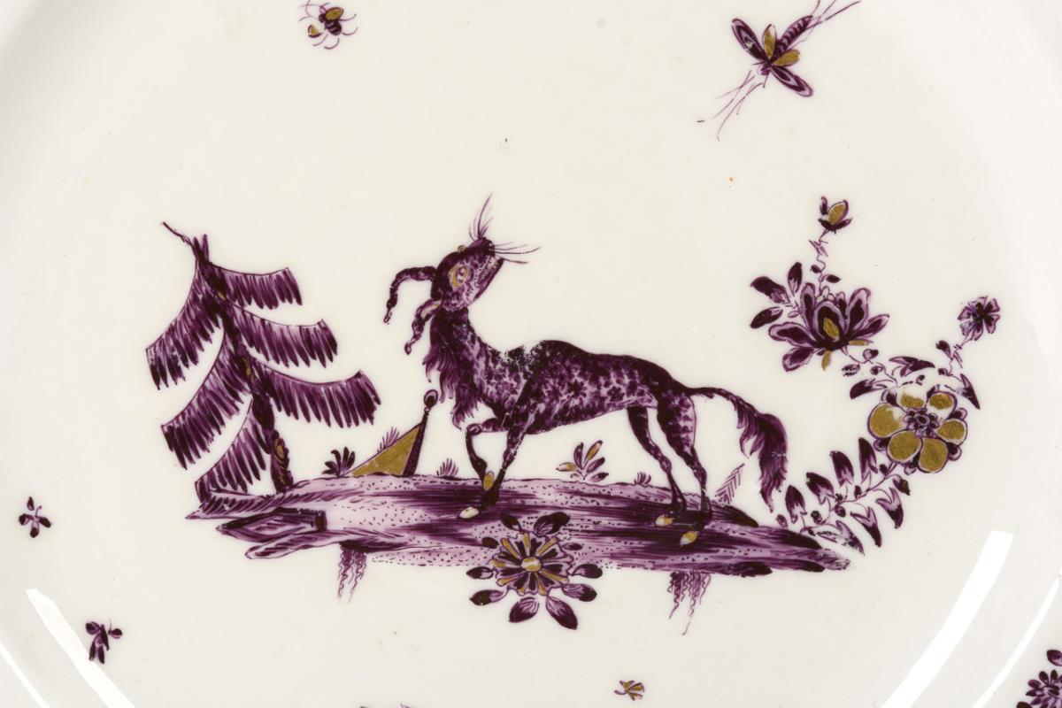 Form "Alter Ausschnitt". Im Spiegel die purpurfarbene Darstellung eines nach einem Insekt schauenden Fabeltieres, umgeben von indianischen Streublümchen. Dekor in der Art des Adam Friedrich Löwenfinck (1714-1754). Minimal berieben.